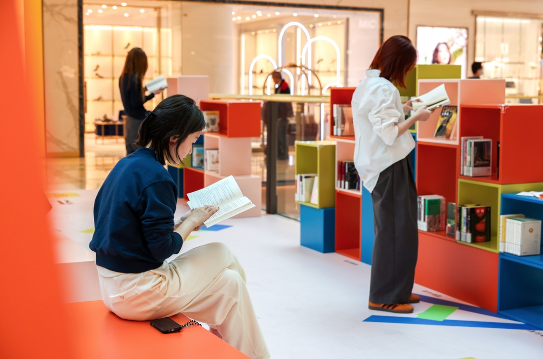 午后的港汇恒隆广场B1层,咖啡香气与油墨芬芳奇妙交融。白领陈女士在等待拿铁的空隙,随手从身旁的木质书架上抽出一本书,就着商场暖黄色的灯光翻阅起来。“以前等餐时刷手机,现在能翻几页喜欢的书,感觉时间都变珍贵了。”在这片商场空间内,由几何模块拼接而成的“阅读岛”,以明快的色彩、丰富的书籍吸引了往来顾客或驻足浏览,或拍照打卡,构成了都市商业空间里一道独特的文化风景。