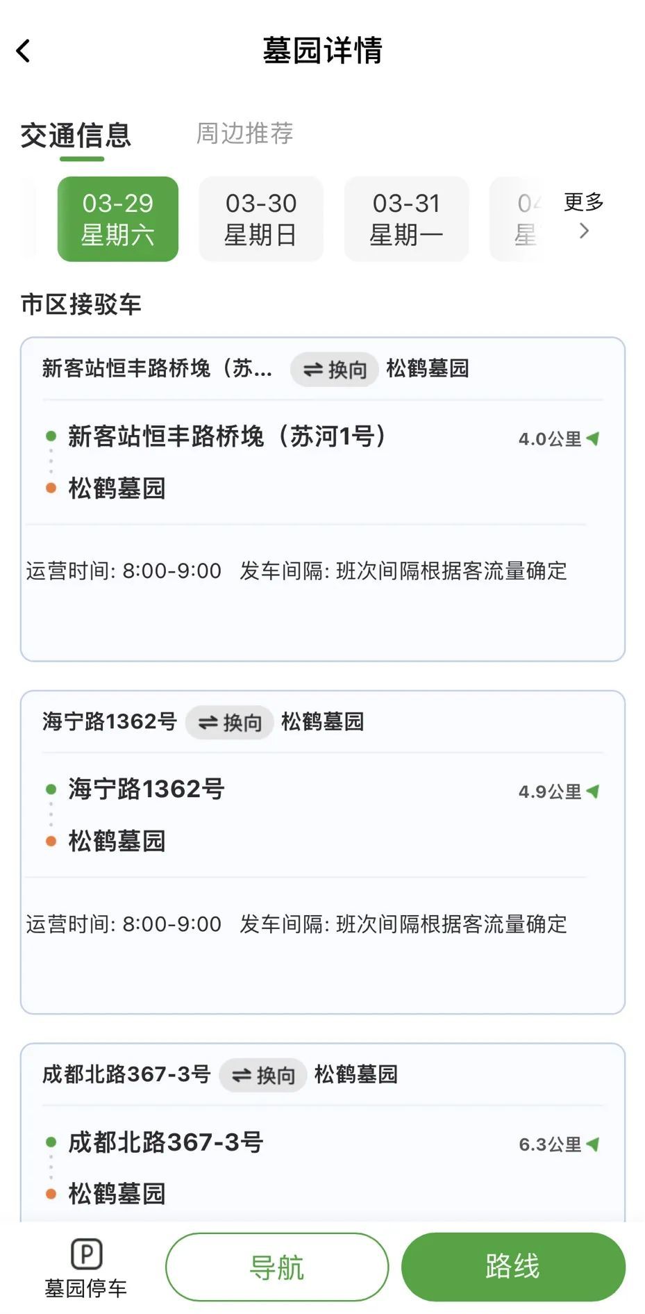 实时公交地铁查询:在墓园详情页“交通信息”版块点击“地铁”或“公交”,获取车辆到站时间与首末班车等信息。