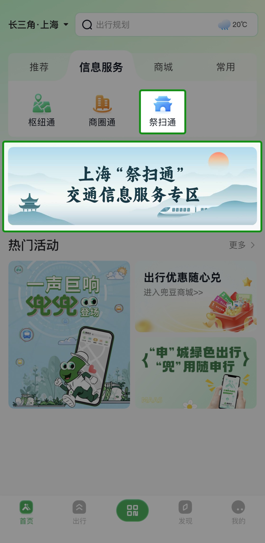 方法二:打开“随申行”平台(APP、微信小程序),点击首页的【上海“祭扫通”交通信息服务专区】,或切至【信息服务】-【祭扫通】,即可进入专区查询