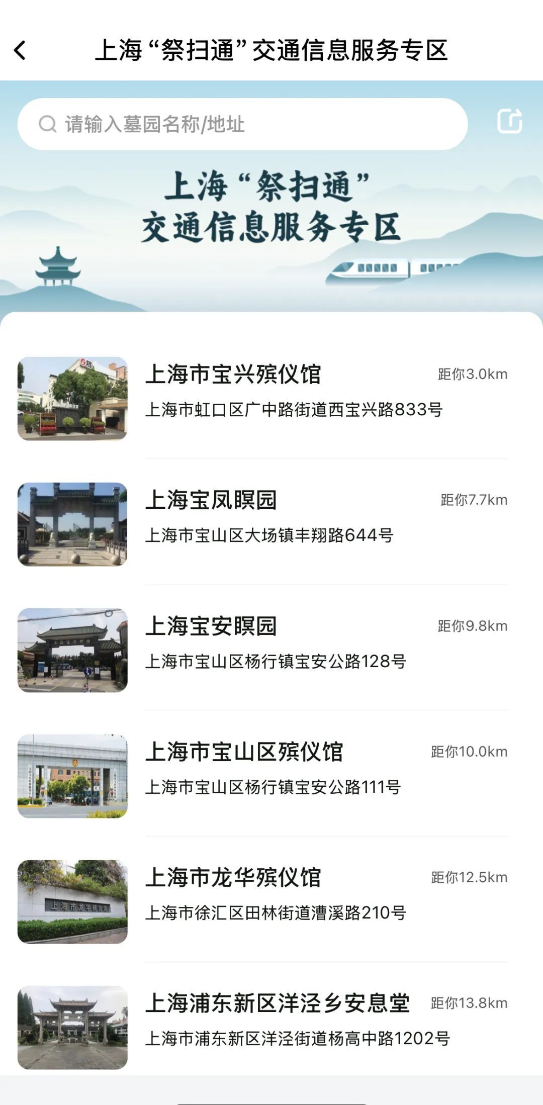 进入专区后,在首页搜索栏输入所要查询的墓园名称或地址,即可进入松鹤墓园的详情页,自由选择公交、地铁、自驾等出行方式。