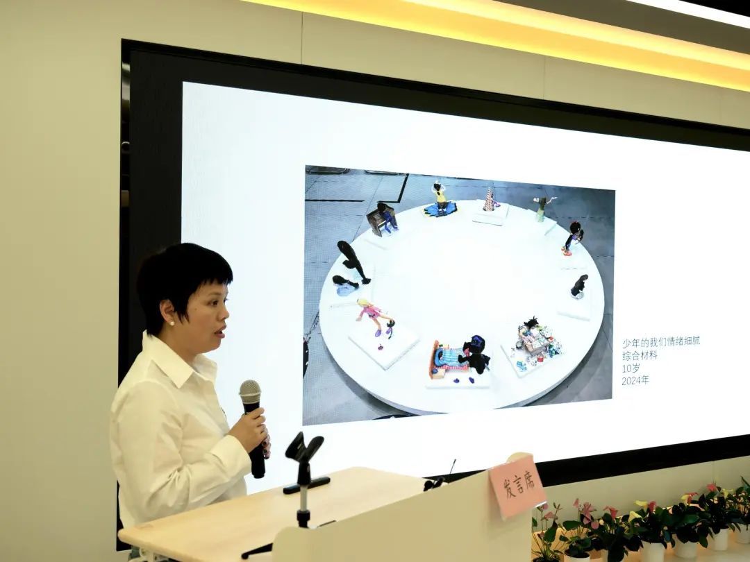 现场,上海油画雕塑院美术馆馆长傅军回顾了去年“初芒计划”公益版块由黄浦区残疾人联合会组织选送的特殊儿童作品,围绕“特殊儿童的个性化表达形式”以及“集体创作方向”两个维度启发与会教师。华东师范大学附属卢湾辅读实验学校、上海市第四聋校、上海市黄浦区阳光学校等三家特殊教育学校美术教师代表依次发言,他们结合本校现有学生作品以及特殊教育实践中的具体案例,与在场艺术家展开了深入的交流探讨。