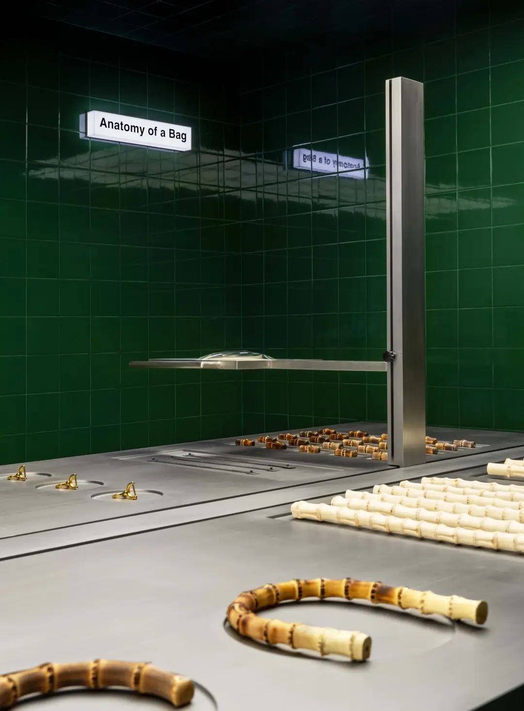 Gucci Bamboo 1947系列竹节手袋经过品牌工匠长达13小时的精心组装,历经428个步骤后才得以华丽诞生。此展厅揭示了手袋的复杂构造,采用类似解剖学的方式逐一展示手袋的各个部件。