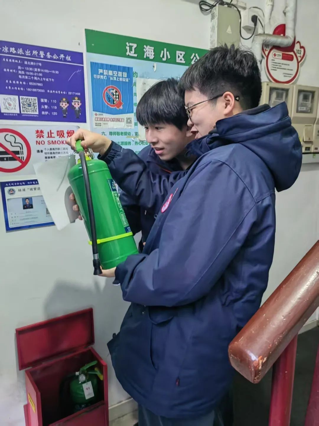 随后,在居委会干部和社区民警的带领下,同学们来到辽海小区,对楼道内的消防设施,逐一进行消防安全检查,检查内容包括灭火器的压力表,消防栓是否完好,消防巡查记录是否完整,消防通道是否通畅等。在检查过程中,同学们也发现了一些小问题,比如部分灭火器存在压力不足,疏散指示标志损坏未修复等情况。发现问题后,社区民警责令物业尽快整改,确保小区消防安全处于可控状态。