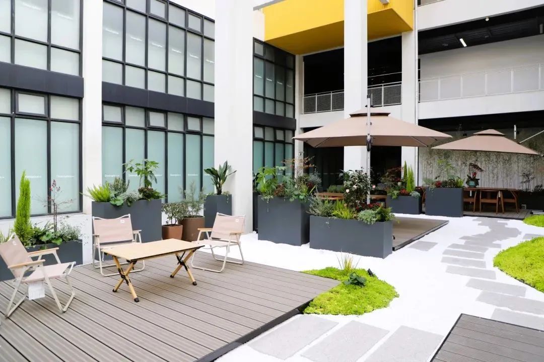 位于园区“C位”主建筑8号楼的半庭居茶空间,是“大零号湾”中一处独具韵味的静谧所在。古朴精巧的庭院与现代建筑相互交融,门前绿植四季添彩。步入其中,便能感受到与园区快节奏科技风截然不同的静谧与悠然,进入了一个充满诗意的春日世界。
