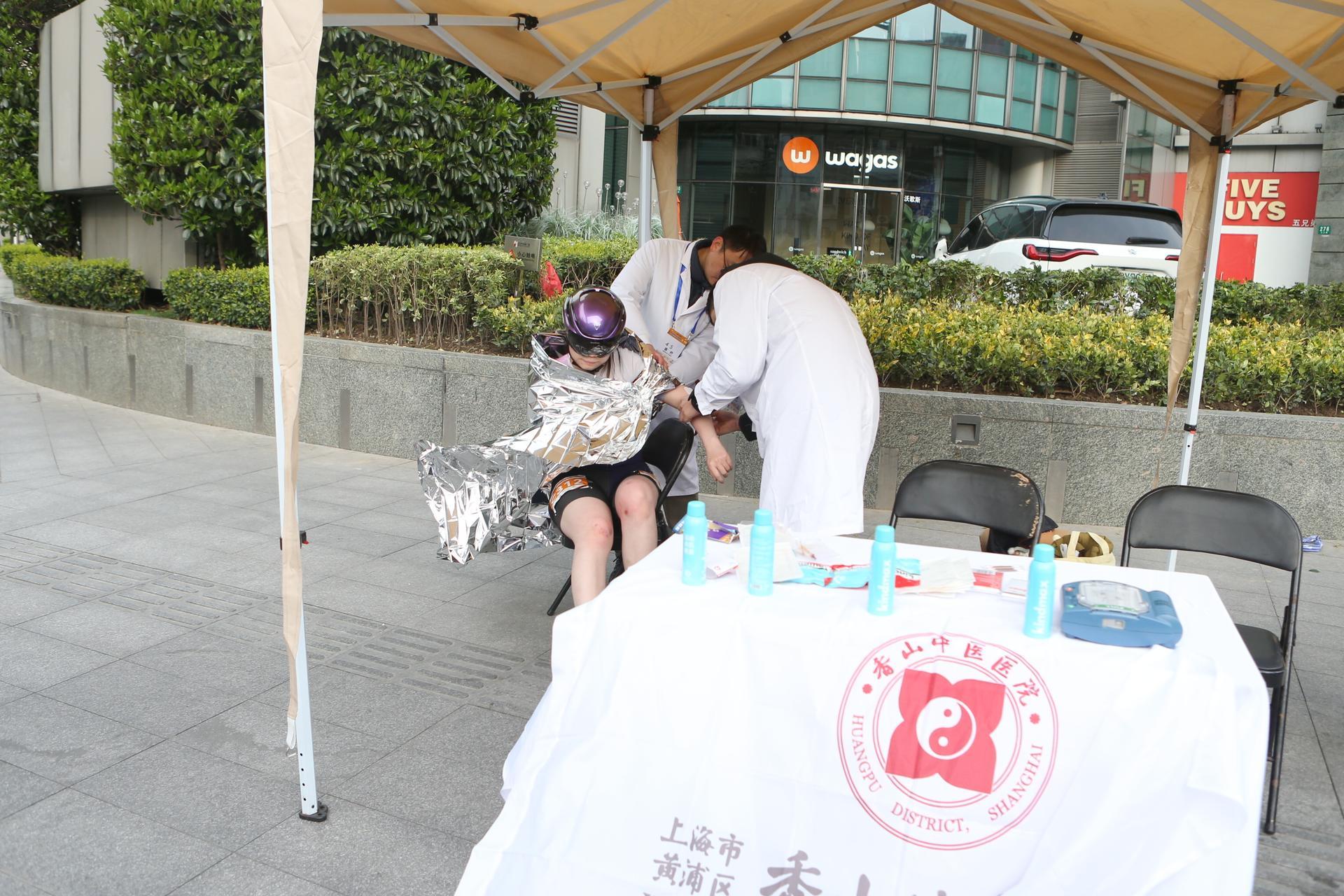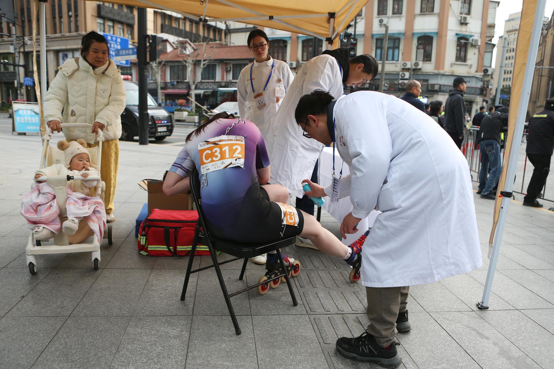 为确保比赛顺利进行,赛事组委会在该路口设置了医疗站点和急救点并配备了相应的急救人员,以保障运动员的安全。果不其然,有一名女选手受伤急需治疗,表情痛苦地蹲在地上。医护人员马上用酒精棉签对伤口处进行消毒,在拉伤处喷上药剂,并贴心地盖上一件衣裳避免着凉。