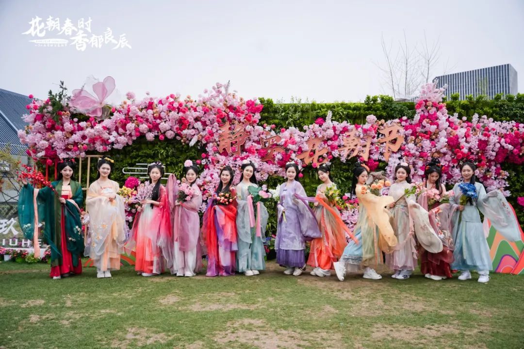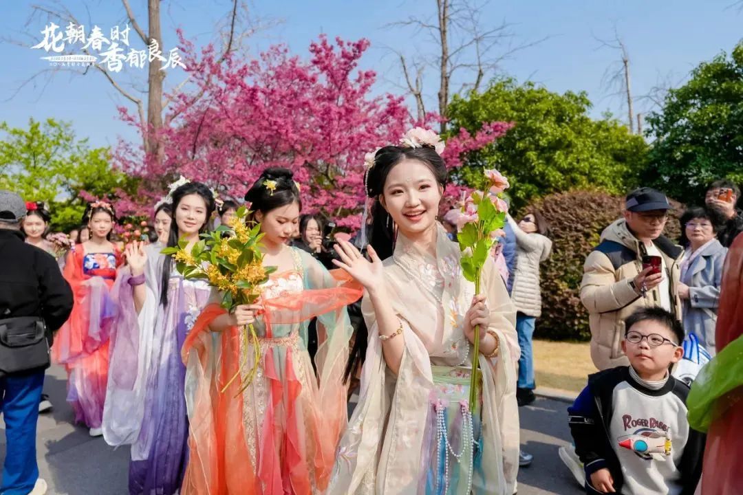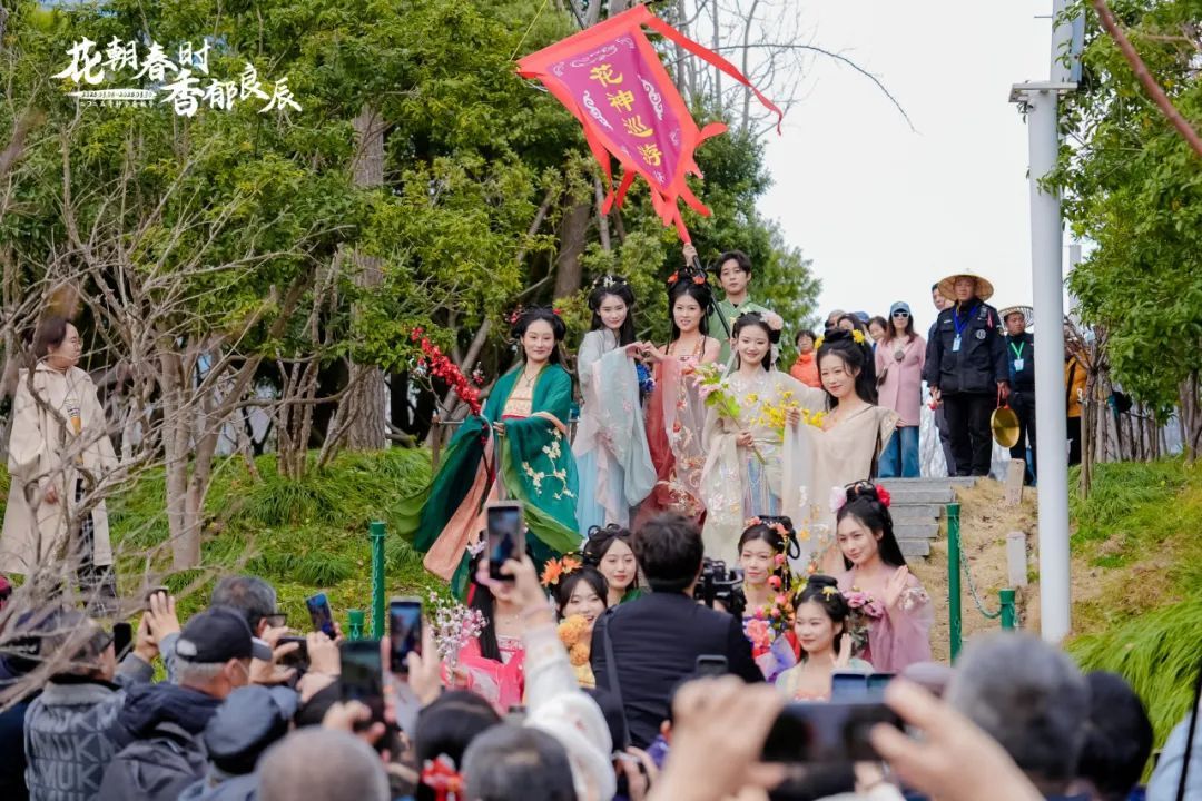 只见“花神”身着华服、点染花钿,翩若惊鸿、踏春而来……市民游客跟随“花神”穿梭于花径间,每一步都仿佛踩在唐诗宋词的韵脚上,感受“花朝节至百花香,踏青寻芳醉春光”的古典浪漫。