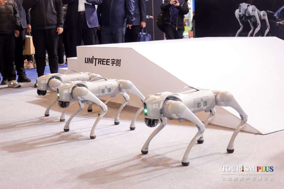 在世博展览馆,观众就能提前体验到“机器人+旅游”的无限潜力:你可以看到春晚红“人”宇树机器人遛它的机器狗,可以试穿《流浪地球》同款爬山和旅拍助力神器傲鲨外骨骼,可以和会跳舞、会做咖啡的人形机器人“清宝”互动。