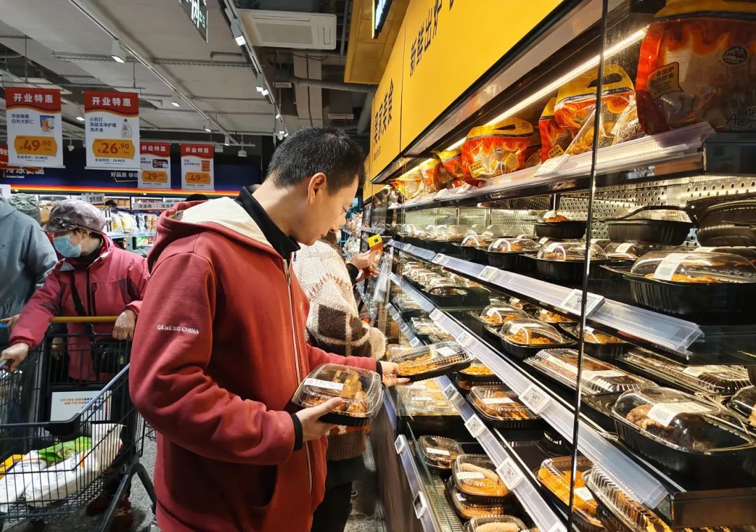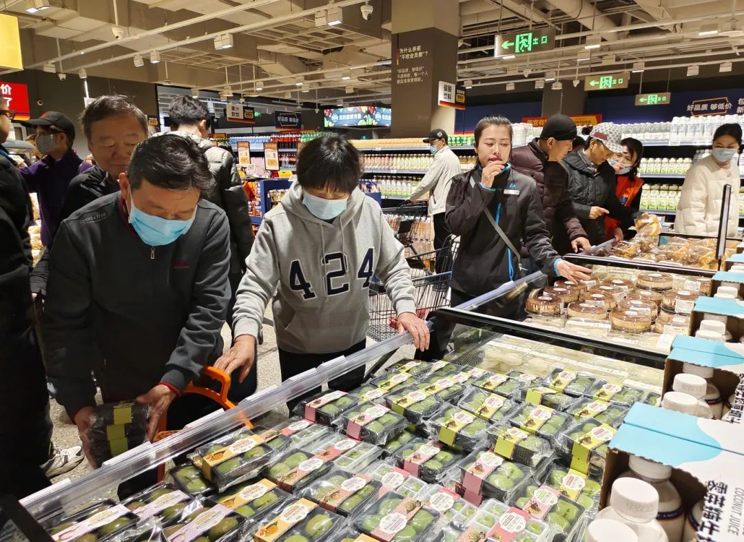 当天上午9点,超市里人头攒动,前来购物的市民络绎不绝。货架上的商品满满当当,涵盖了生鲜食品、日用百货、酒水饮料等全品类,满足家庭日常所需。其中,新鲜的蔬菜水果、肉类、海鲜、乳制品以及奥家厨房的自制熟食格外受欢迎。丰富的商品种类和高性价比吸引了大量市民前来选购。