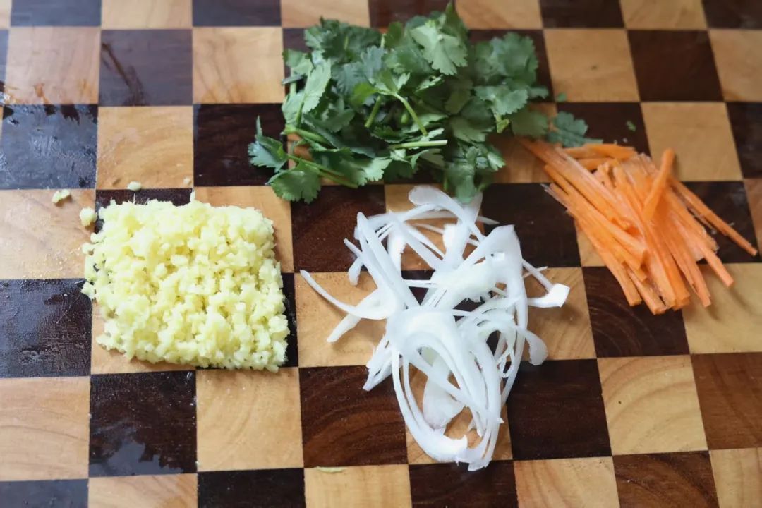 胡萝卜、大葱切丝,生姜切末,香菜切段备用。