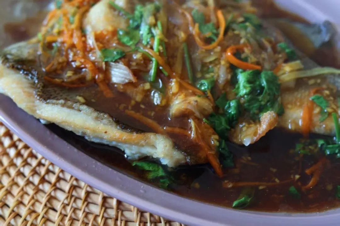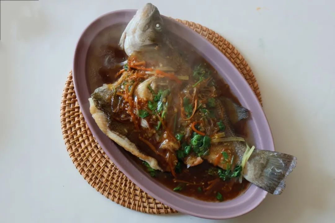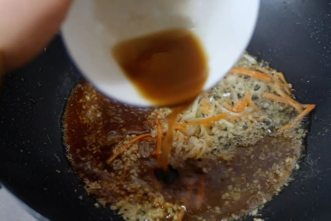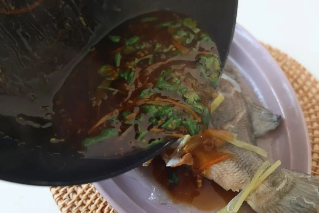 8.加入胡萝卜丝、香菜,在蒸好的鱼上均匀淋上酱汁。
