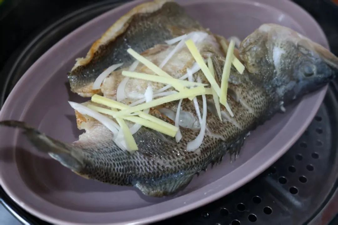 铺上姜丝和大葱丝,水开上锅大火蒸8分钟。
