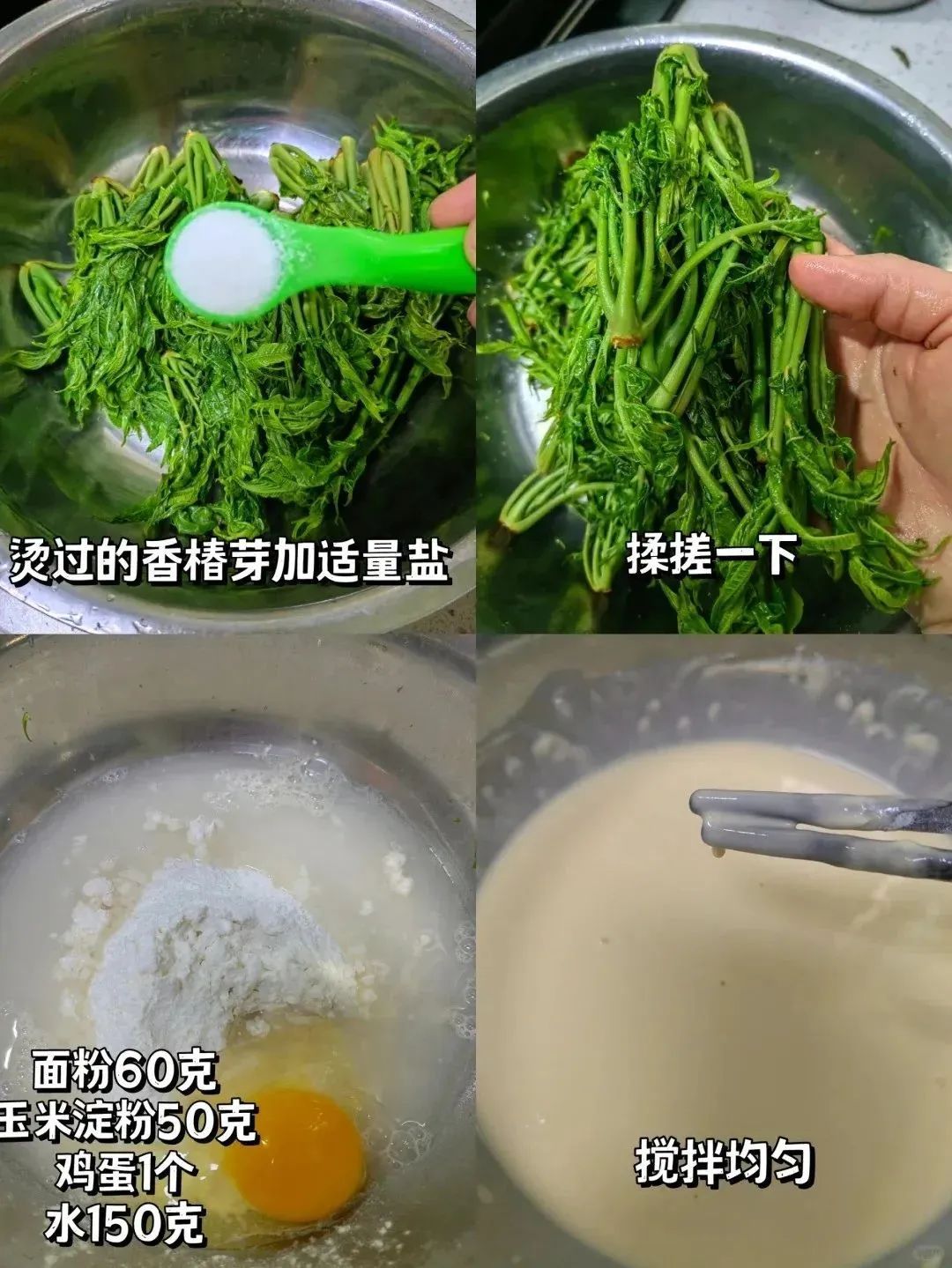 香椿芽、鸡蛋、玉米淀粉、面粉。