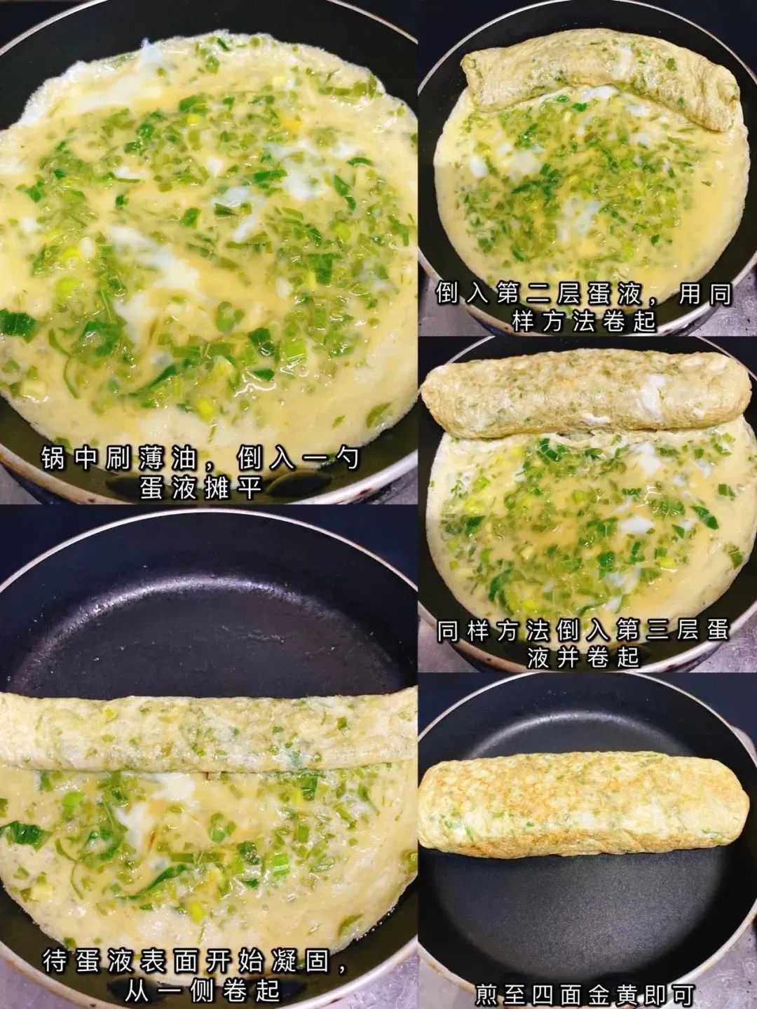 6、等鸡蛋液呈半凝固状态再慢慢往里卷,卷好后再两边煎至金黄色出锅。