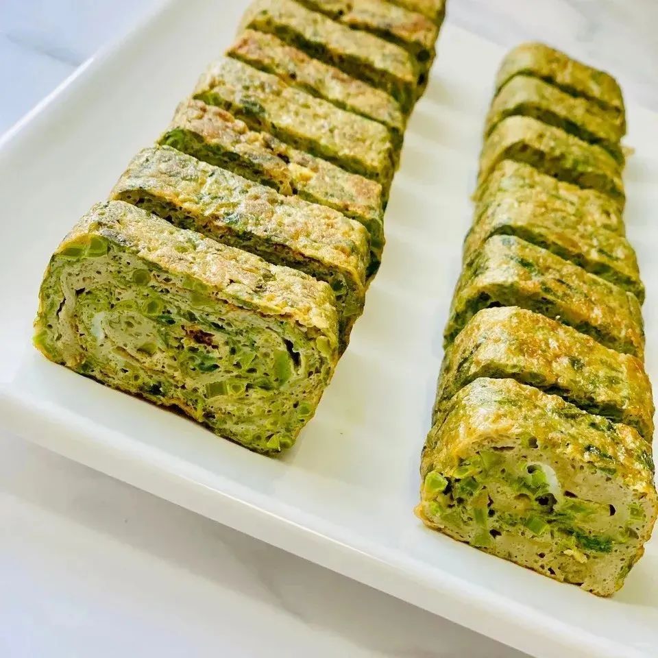 7、切成两厘米宽的鸡蛋卷,香椿厚蛋烧就做好了。