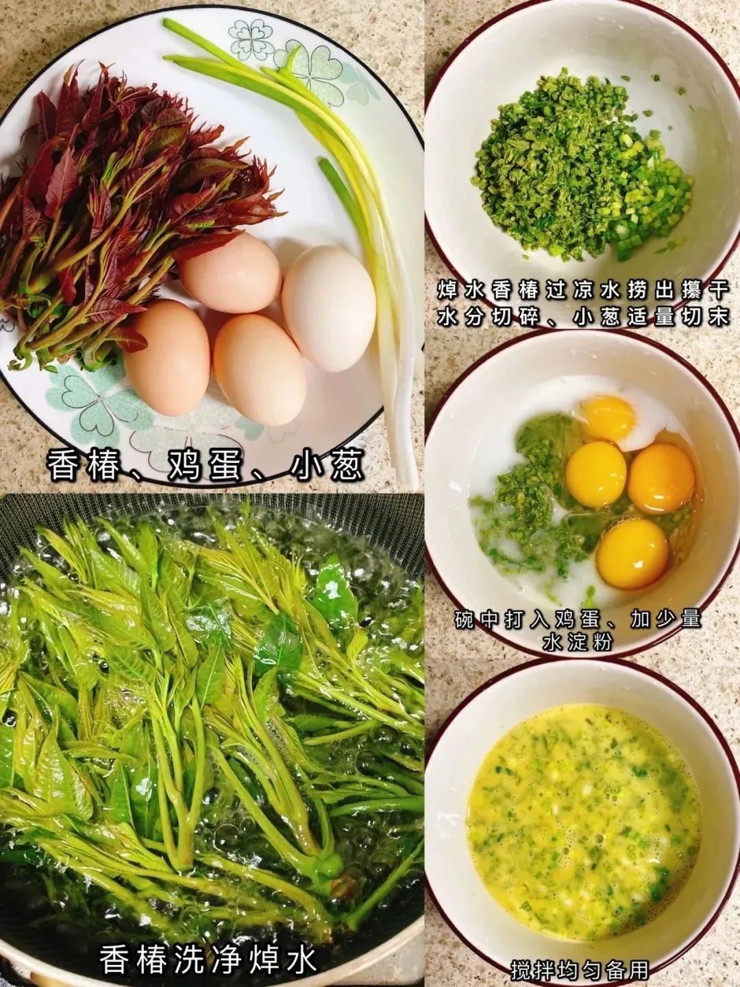 香椿50g,鸡蛋4个,小葱、盐适量。