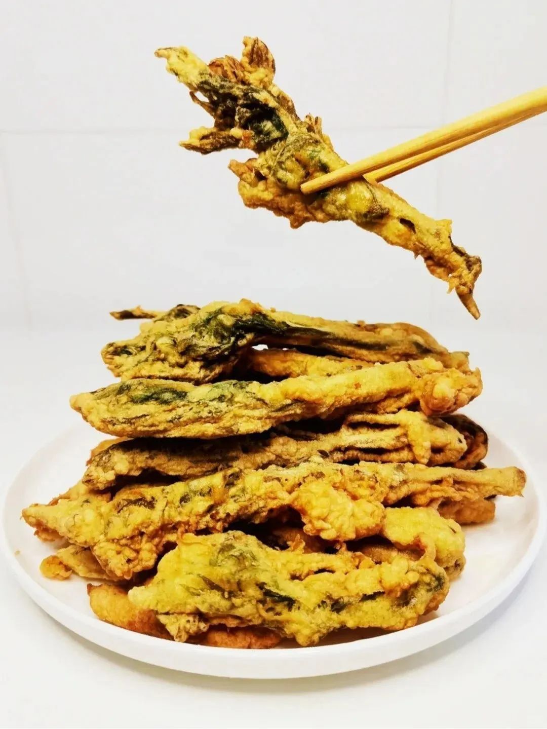 4、香椿芽均匀的裹满面糊,用筷子夹着一根香椿芽抖开下锅。