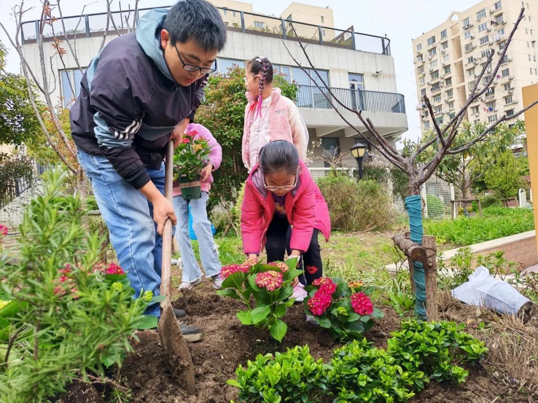 北新泾街道联新第二党支部副书记徐莹介绍,这次新种的绿植来自多方共建力量。比如,新泾四村的七彩护绿园艺志愿者团队,带来了海棠和杜鹃花;沿街商铺惠惠花艺店捐赠了栀子花,还提供专业的园艺工具,带孩子们一同植栽。