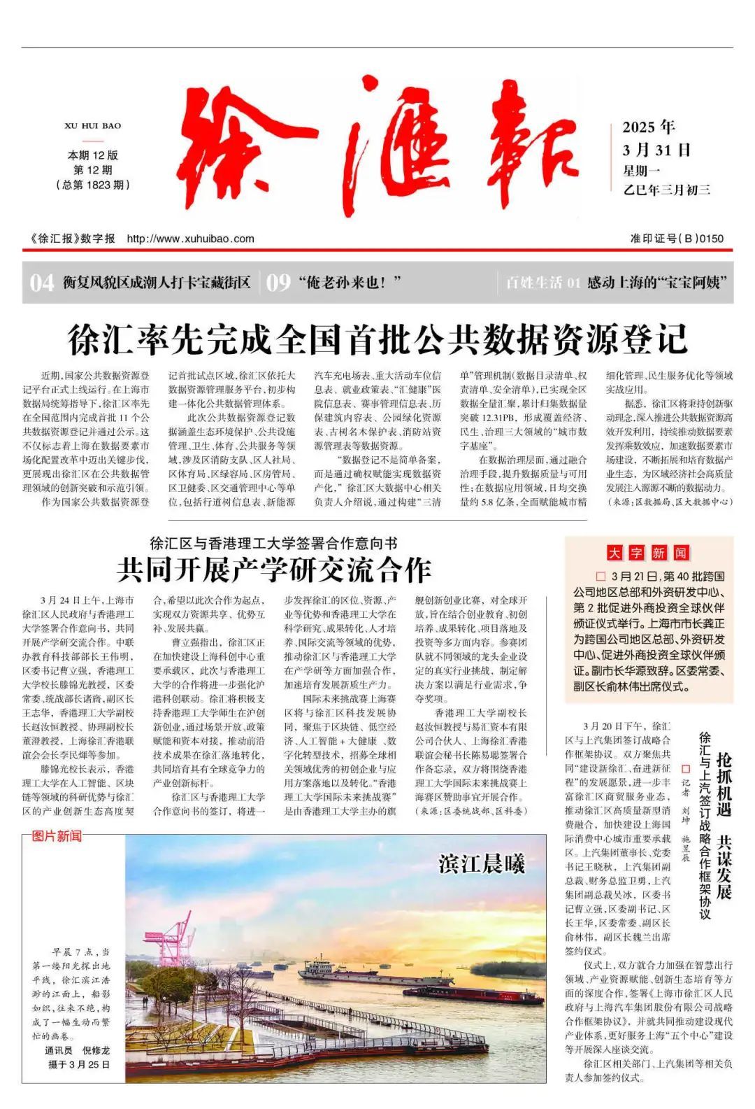 身为徐汇区居民,您可知道今后我们居住环境美化、民生服务改善、城市管理提升,要怎么做,才可以事半功倍呢?对此,徐汇区已有创新突破之举!在数据要素市场化配置改革中迈出了关键步伐,让公共数据资源真正用于实践,优化服务于经济、民生、治理等领域,默默耕耘走到全国首批前列。若欲知其详,请关注本期头版要闻。