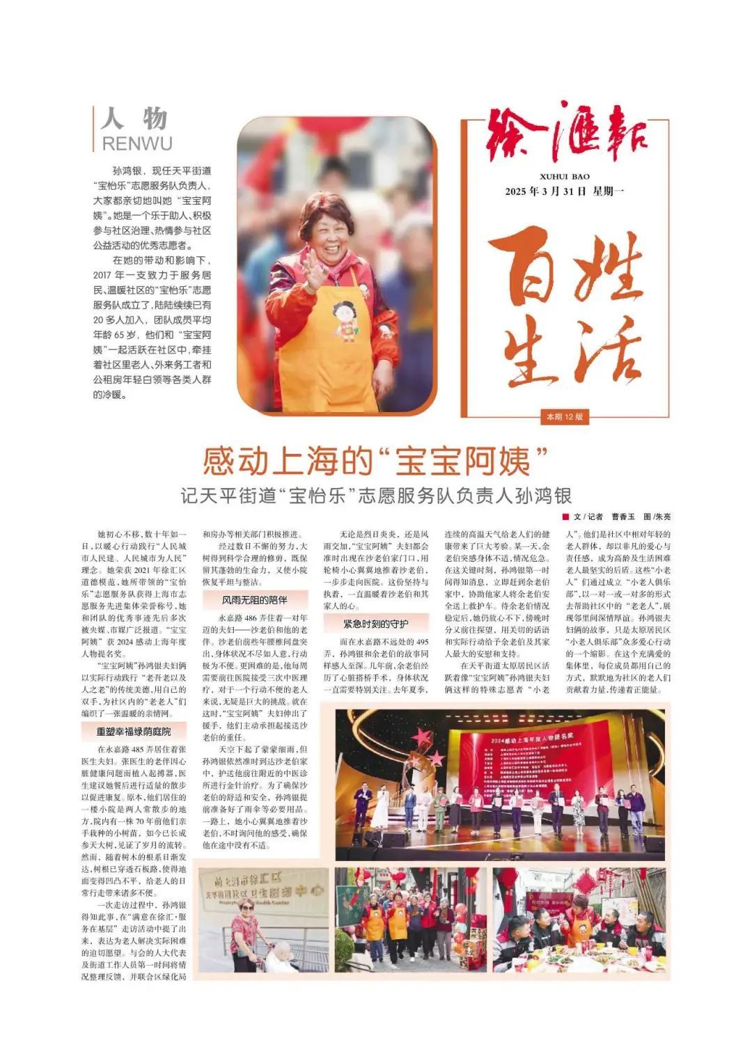 她联合多家部门,修整了凹凸不平的石板路;她风雨无阻、陪伴行动不便老人就医;她紧急救助突发病情老伯脱离险境;她就是——天平街道“宝怡乐”志愿服务队的“宝宝阿姨”孙鸿银!她既是我们社区助老爱老的“宝宝”,更是传递时代善行、弘扬精神文明的好“宝宝”。