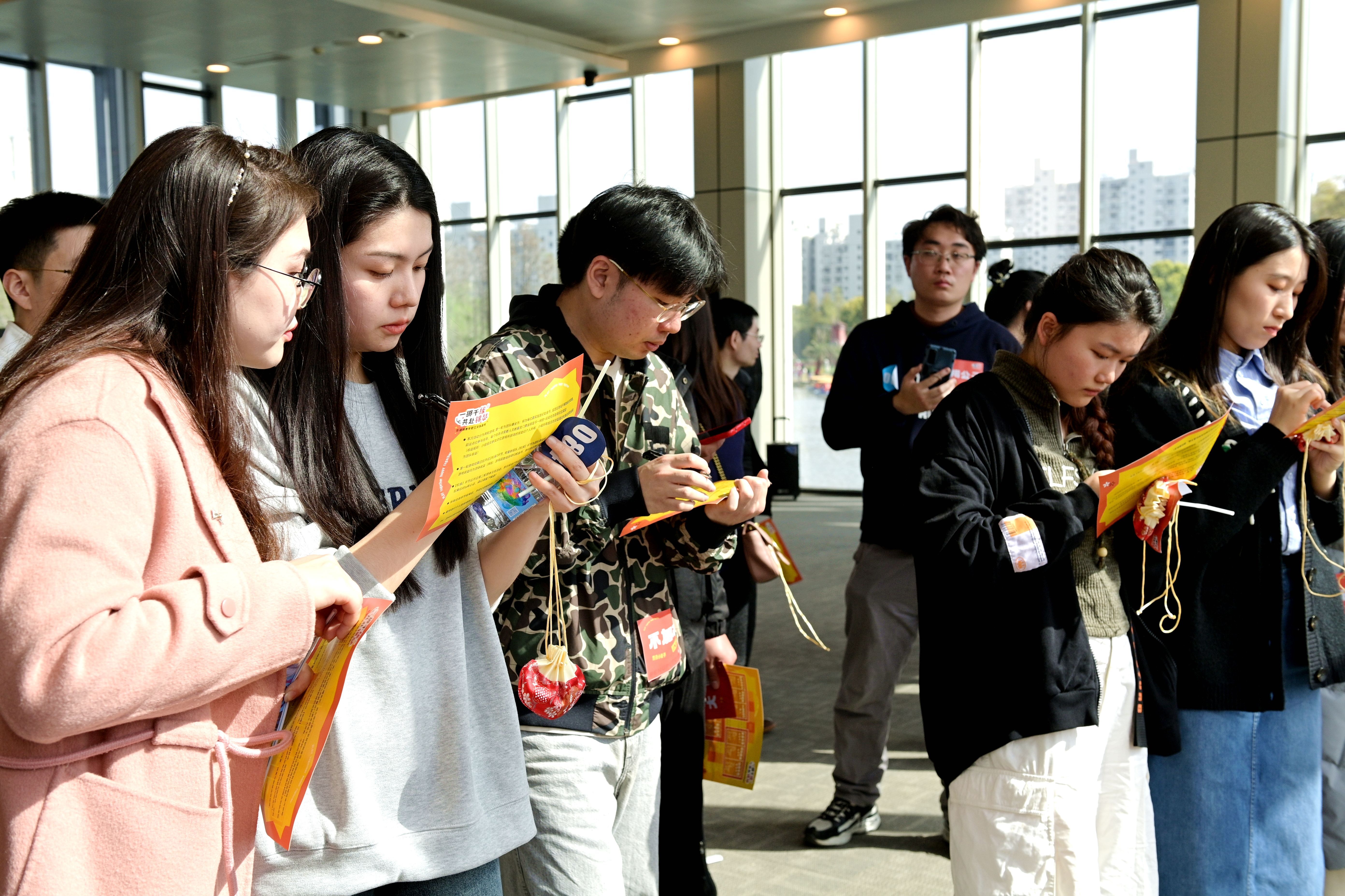 进入互动游戏环节,参与者被分成10个小组,每组10人,男女混搭,需要根据任务卡上的提示,在室内各个点位完成任务,赚取“财运铜钱”。记者在现场看到,考验脑力、体力、默契的游戏环节令青年职工们全身心沉浸在活动中,也在“通关打怪”中增进了彼此间的了解和信任。