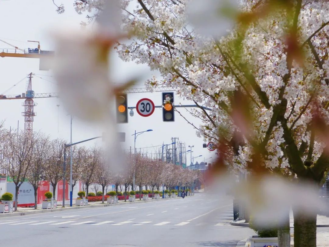 骑车途经中德路(平原街-崇南路),犹如进入了一条樱花隧道,道路两侧的染井吉野樱正用满树繁花演绎春日限定浪漫。微风吹过,花瓣如雪纷飞,随手一拍都是春日大片。最后骑行至西泾港路,欣赏两侧金灿灿的油菜花。