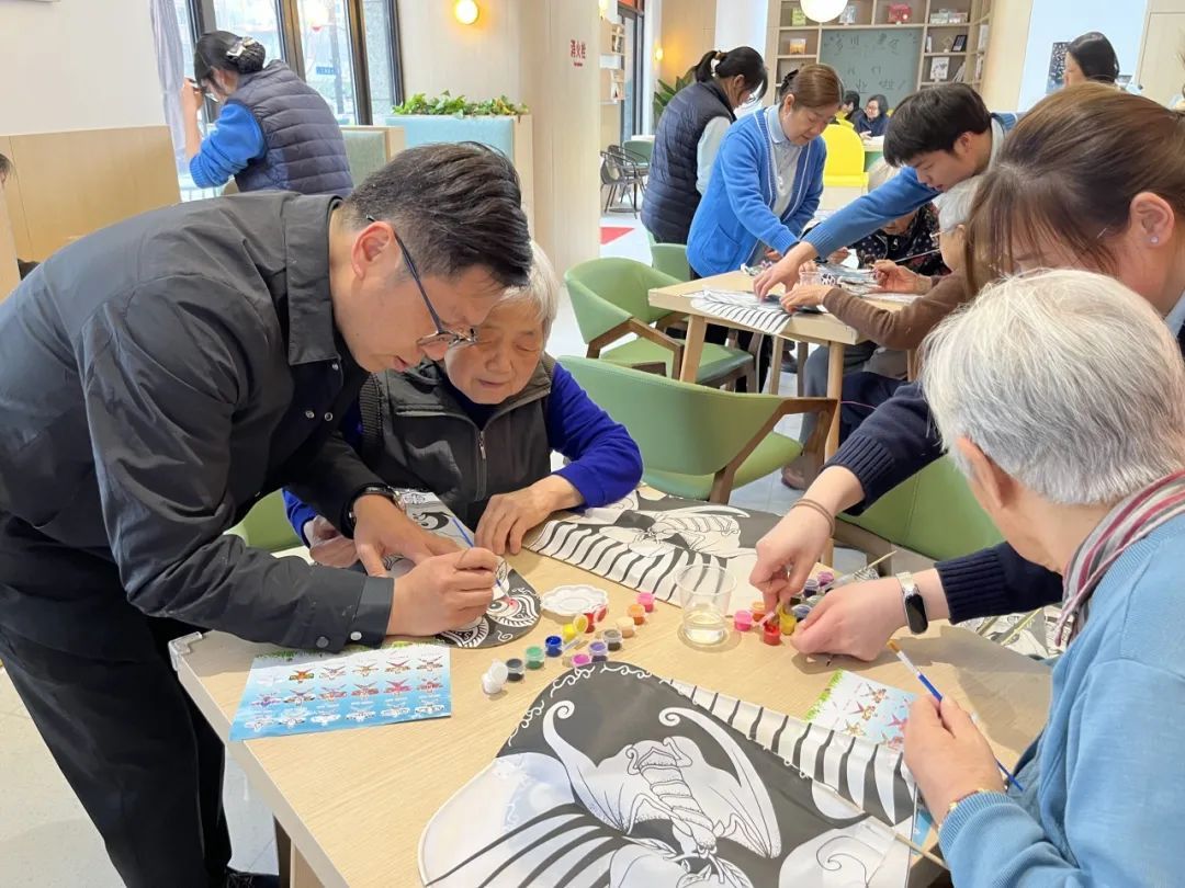 近日,一个春日的午后,阳光透过玻璃窗,洒落杨浦区江浦路317号的幸福养老社区综合为老服务中心。数十位老年学员围坐桌前,手持画笔,专注地为素色的纸鸢涂抹色彩。