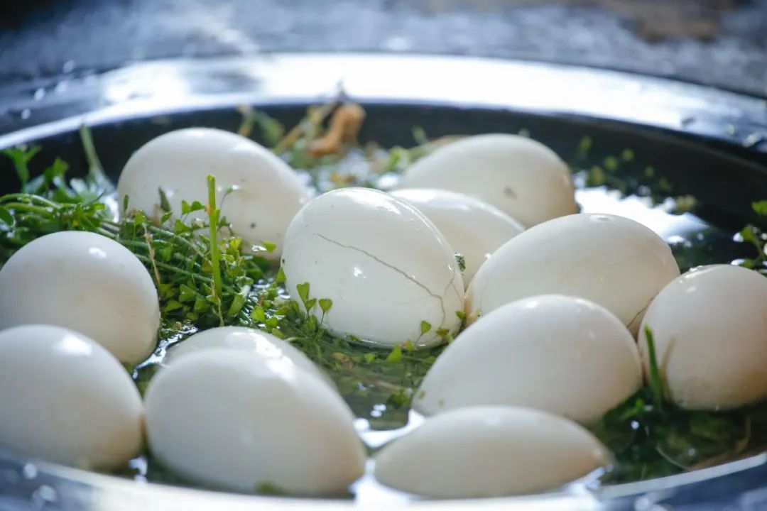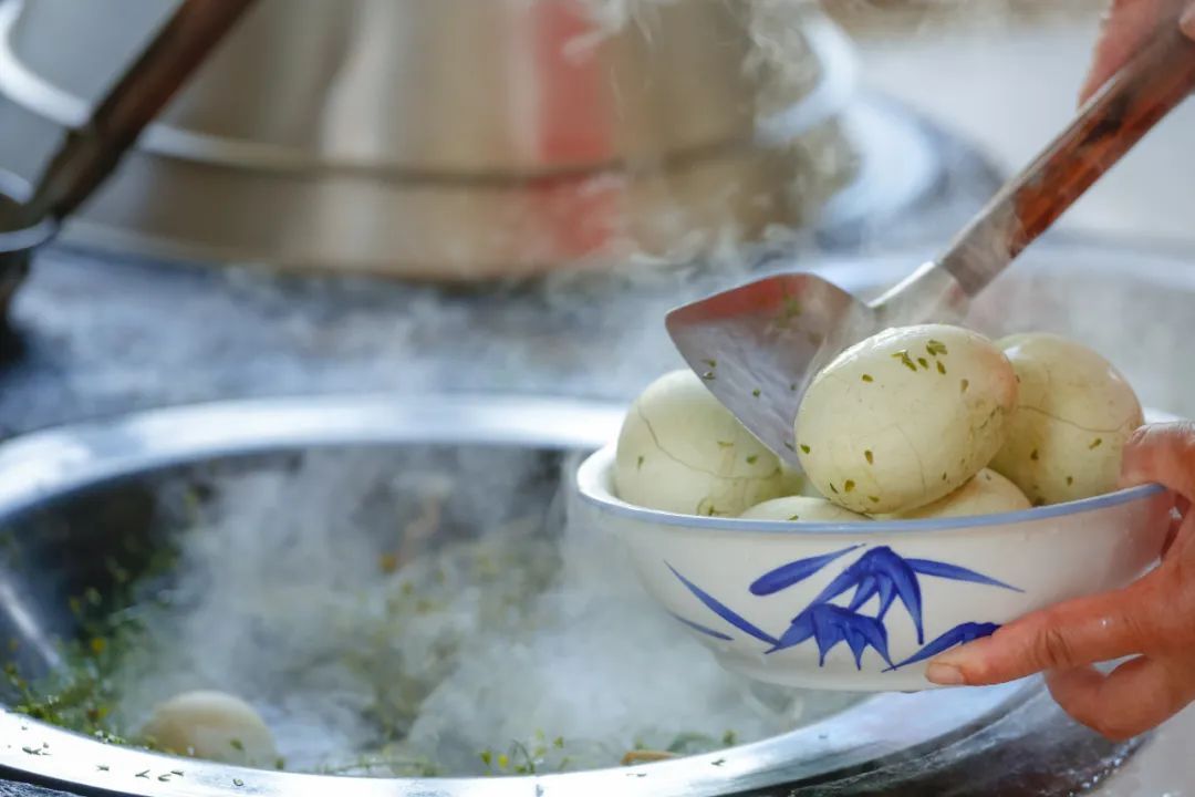 随着升腾而起的热气,厨房里弥漫着荠菜的清香。为了让菜汁更好地入味,还需将煮熟的鹅蛋蛋壳逐一敲破。