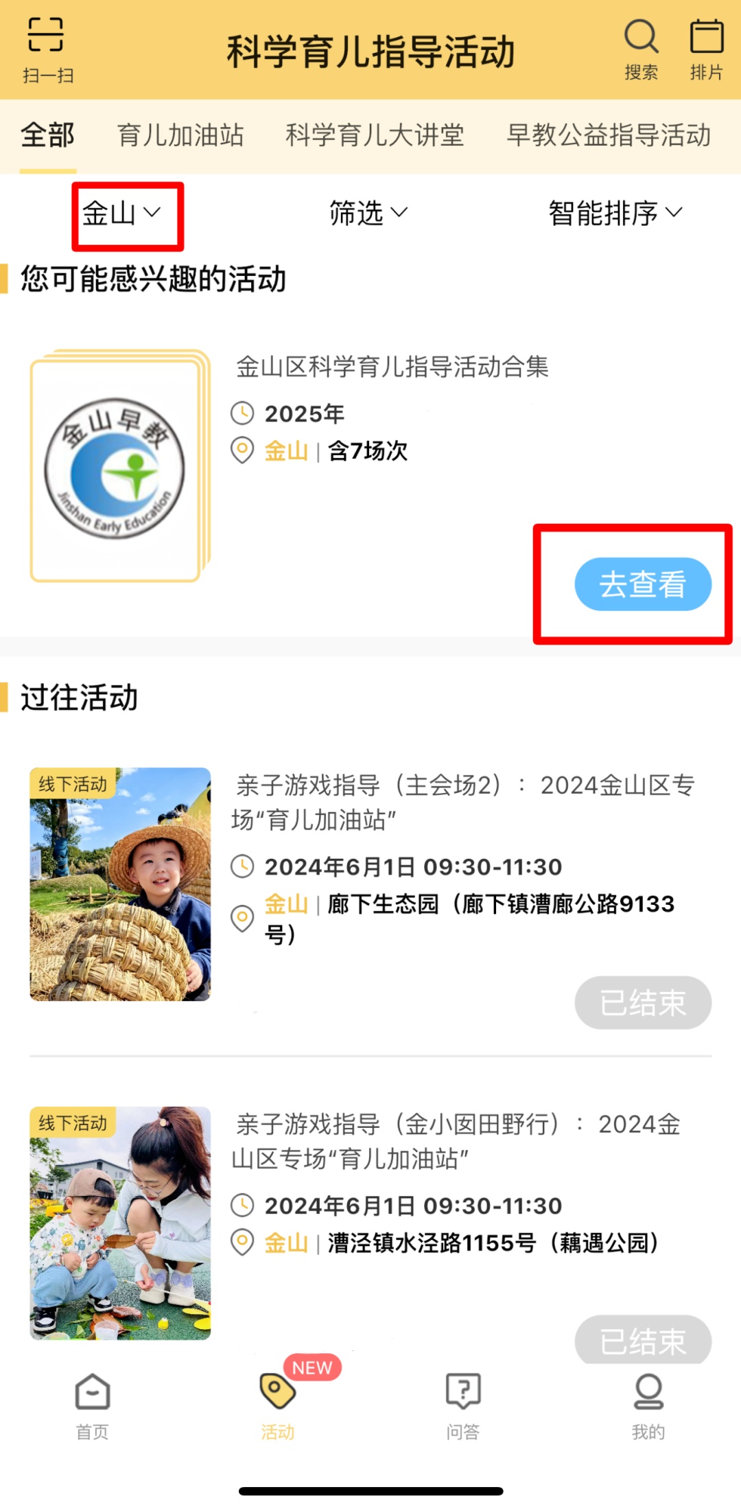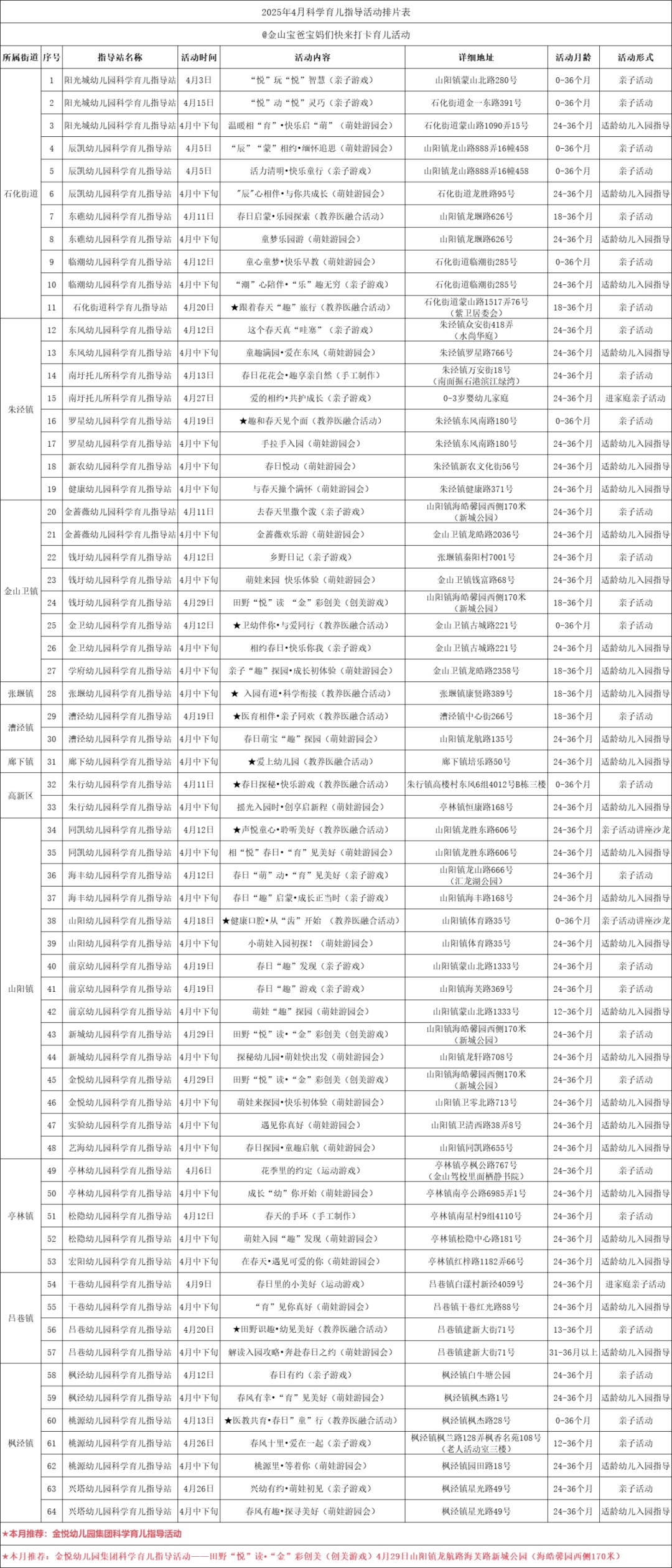 金山区“金小囡”育儿系列 科学育儿指导活动安排表来啦 @金山宝爸宝妈 快来打卡4月科学育儿活动 4月科学育儿指导活动安排表 报名方式 1.打开“育之有道”App,点击“活动”,进入此页面。 2.选择“金山”,就能看到金山区各家庭科学育儿指导基地、指导站发布的活动信息。 3.点击“去查看”,选择你想参加的活动报名。 温馨提示: 1.安排表为预设活动安排,活动时间以“育之有道”App上发布为准,如无个别特殊情况,各指导基地、指导站将按安排表开展活动。 2.如安排表中的活动未发布,“育之有道”App上不会显示。 资料来源:区教育局 编辑/责编:程佳域 审核:陈建军、林堃
