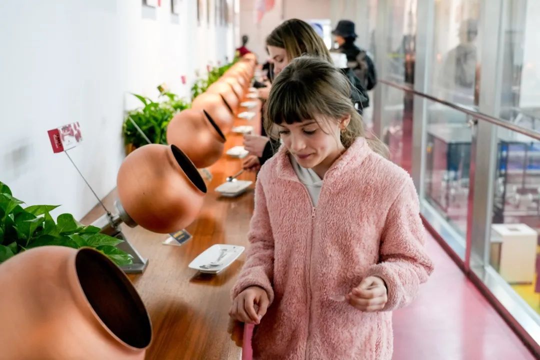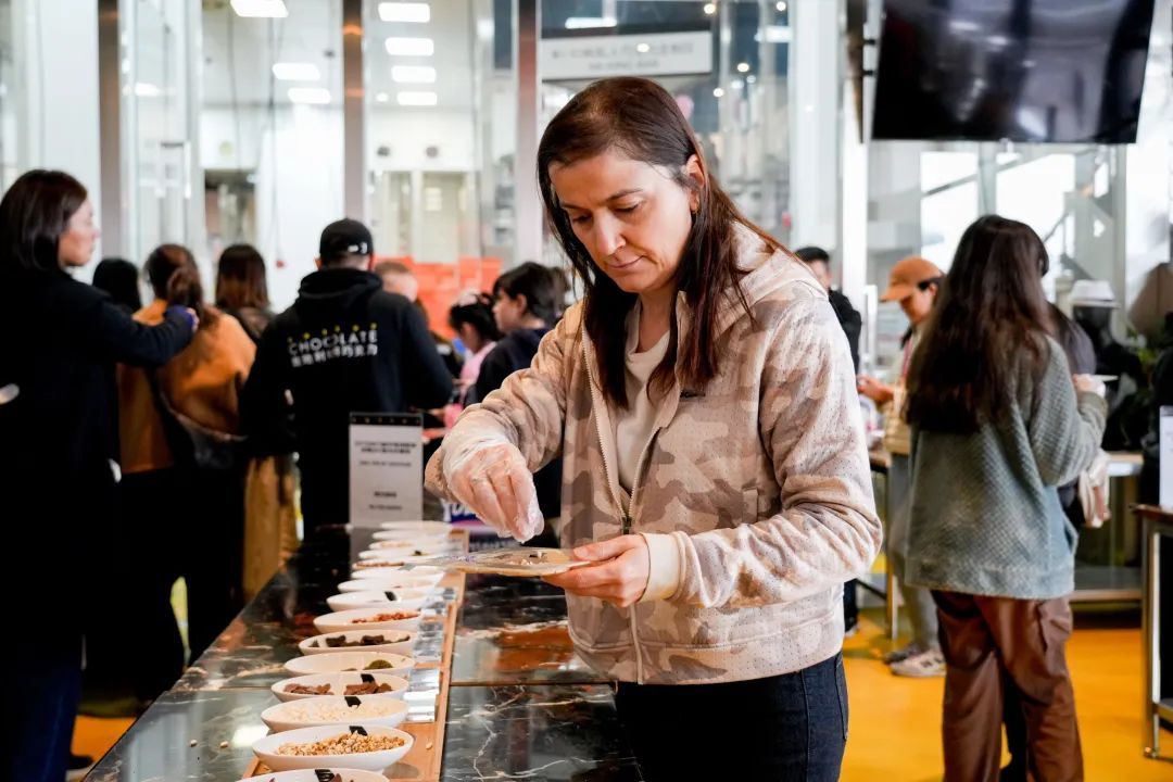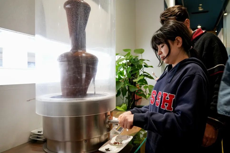 “好香!”一踏入馆内,不少人就被醇厚的可可香气所环绕。在可可喷泉区,带着热气的巧克力原浆倾斜而下,甜香四溢,大家纷纷尝试、新鲜感十足;在展示区,百余种风味各异的巧克力“乱花渐欲迷人眼”,甚至包括姜黄、豆蔻、辣椒、茴香等特色风味,又引得不少人依次试吃,流连忘返。