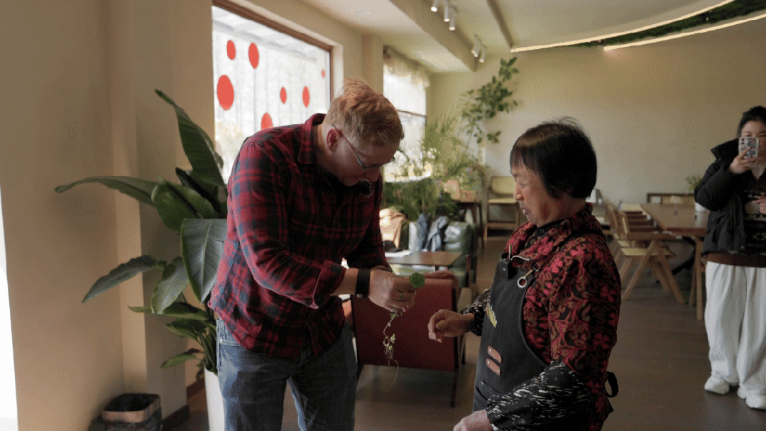在这里,大洋和咖啡店的吴爱芳阿姨成了好朋友。吴阿姨告诉大洋,她就是胡光村的村民,现在年纪大了,还能在村里找到环境这么好的工作,和年轻人一起干活,每天都很开心。