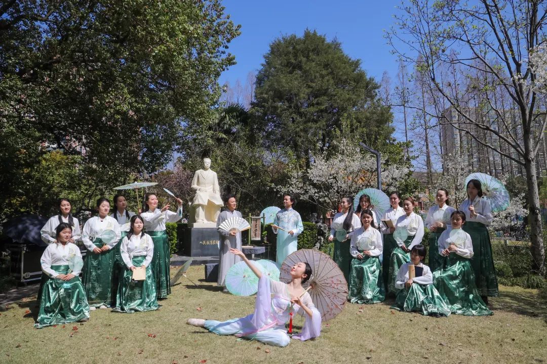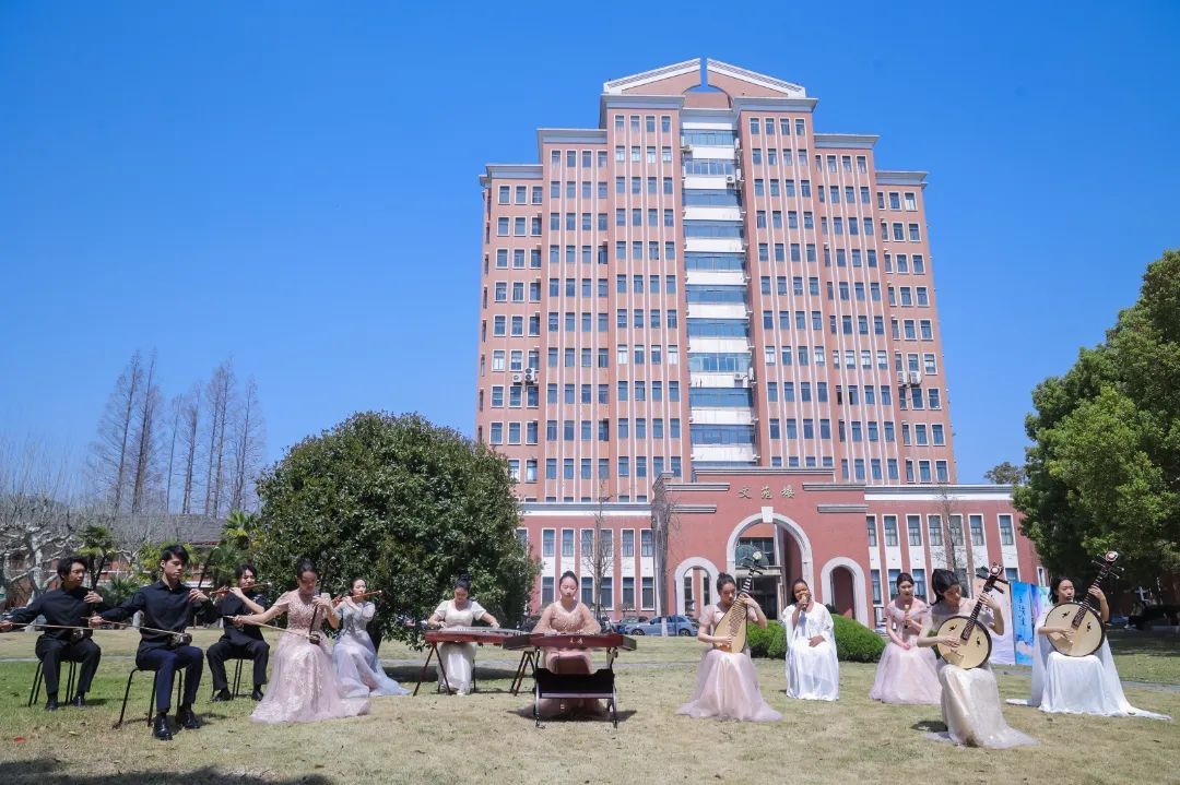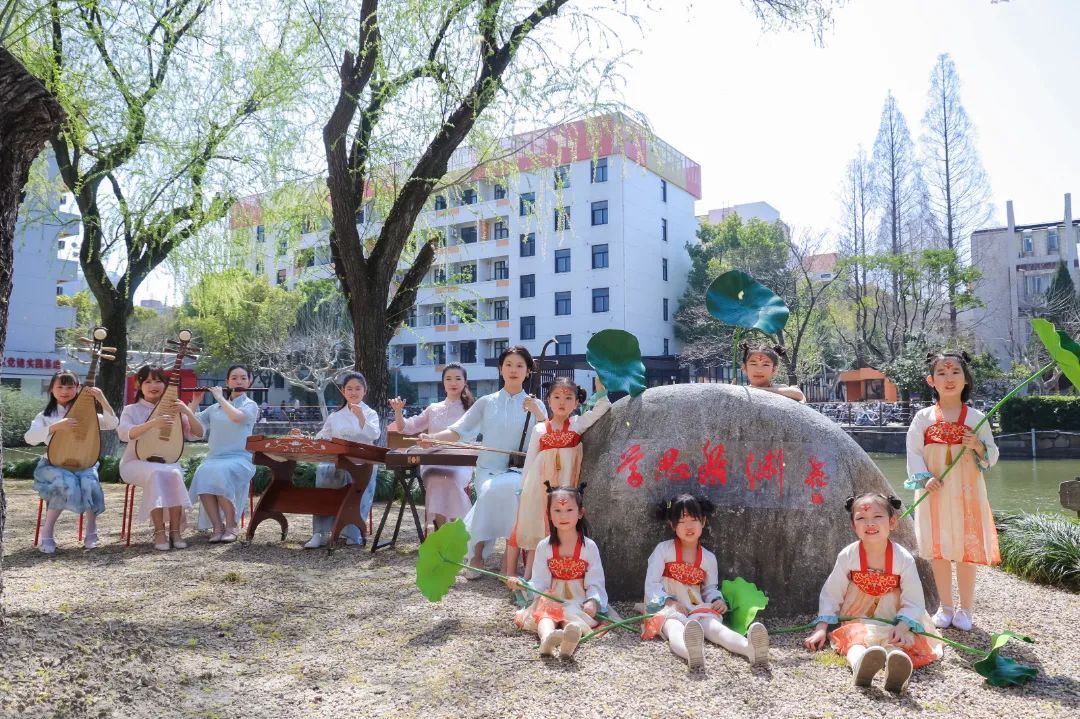展示周内,一场打破常规舞台形式的“诗语江南”丝竹诗乐演出,成为本届艺术周最具创新性的文化实验。师生们将《春满江南》《声声慢》等七首原创曲目的演出场地,从音乐厅搬到了“上序书声”“学思泉渊”“行知弦歌”等校园景观中。古筝的泛音与泉水的叮咚应和,笛声穿过垂柳与书香交织,观众追随着乐声在校园中移步换景,体验着“耳得之而为声,目遇之而成色”的立体美学。本场演出由该院的本、研学生联袂市青少年活动中心的中小学生共同演绎。这一场“大中小一体化”的浸润式美育实践,不仅让传统文化焕发新生机,更开创了“行走的美育课”新模式。