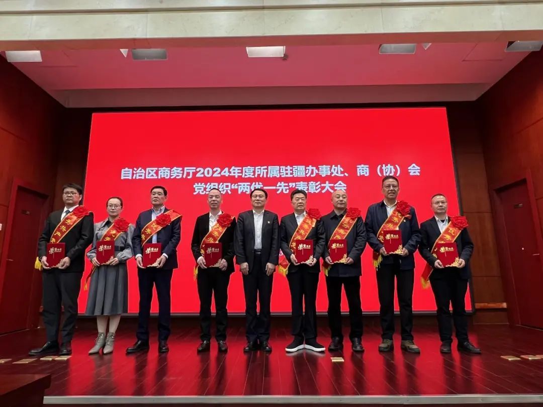 近日, 新疆维吾尔自治区商务厅在乌鲁木齐市上海大厦召开驻疆办事处和商(协)会工作座谈会暨“两优一先”表彰会。