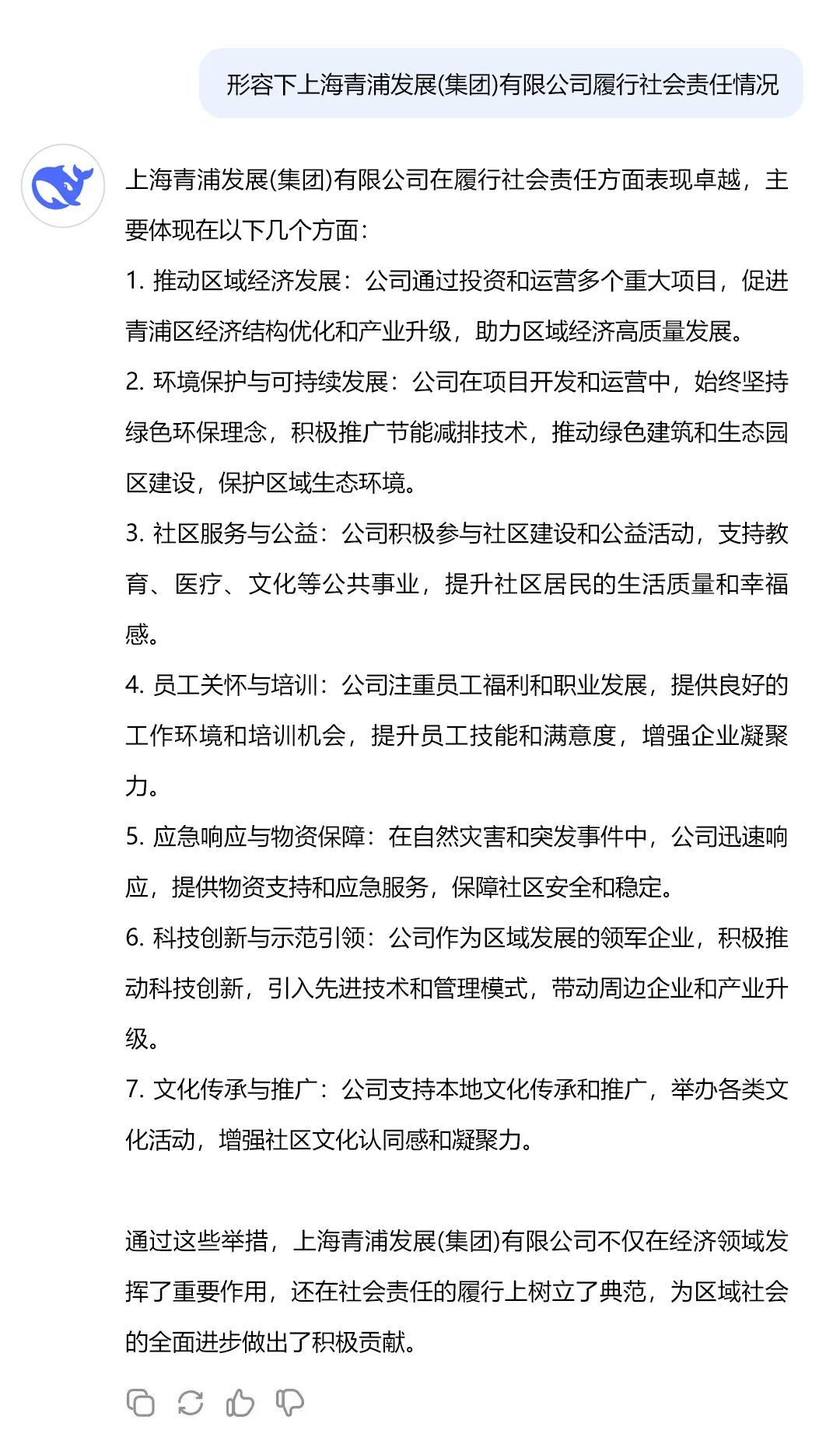 DeepSeek:上海青浦发展(集团)有限公司在履行社会责任方面表现卓越,主要体现在以下几个方面: