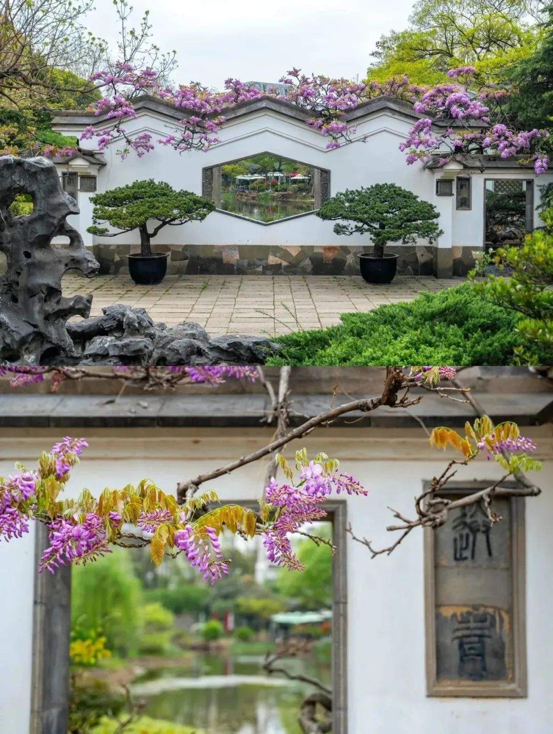 吟苑公园每年一到四月就有一片流动的“紫”,花架山墙上的紫藤花墙沿着屋檐垂下来,为这古色古香的江南园林平添了童话色彩。