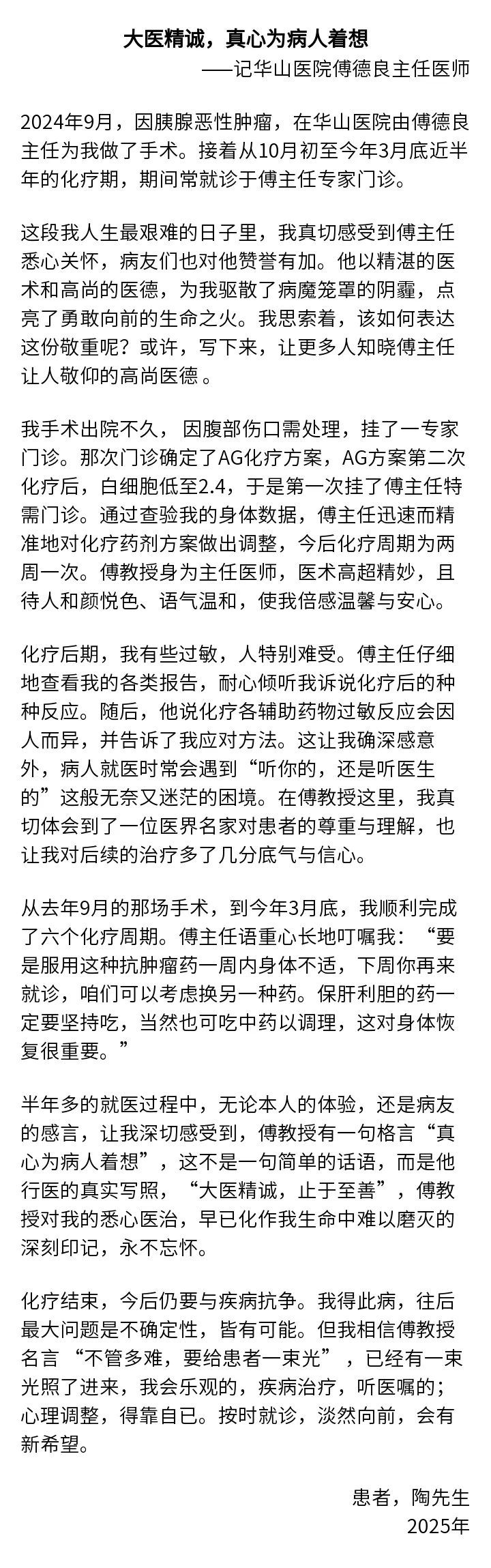 2024年9月,75岁的陶先生因罹患胰腺恶性肿瘤,在上海华山医院胰腺外科主任傅德良教授团队的治疗下,成功接受肿瘤切除手术,并历经半年化疗后重获新生。这段与病魔抗争的历程,让他深切感受到“大医精诚”的力量。