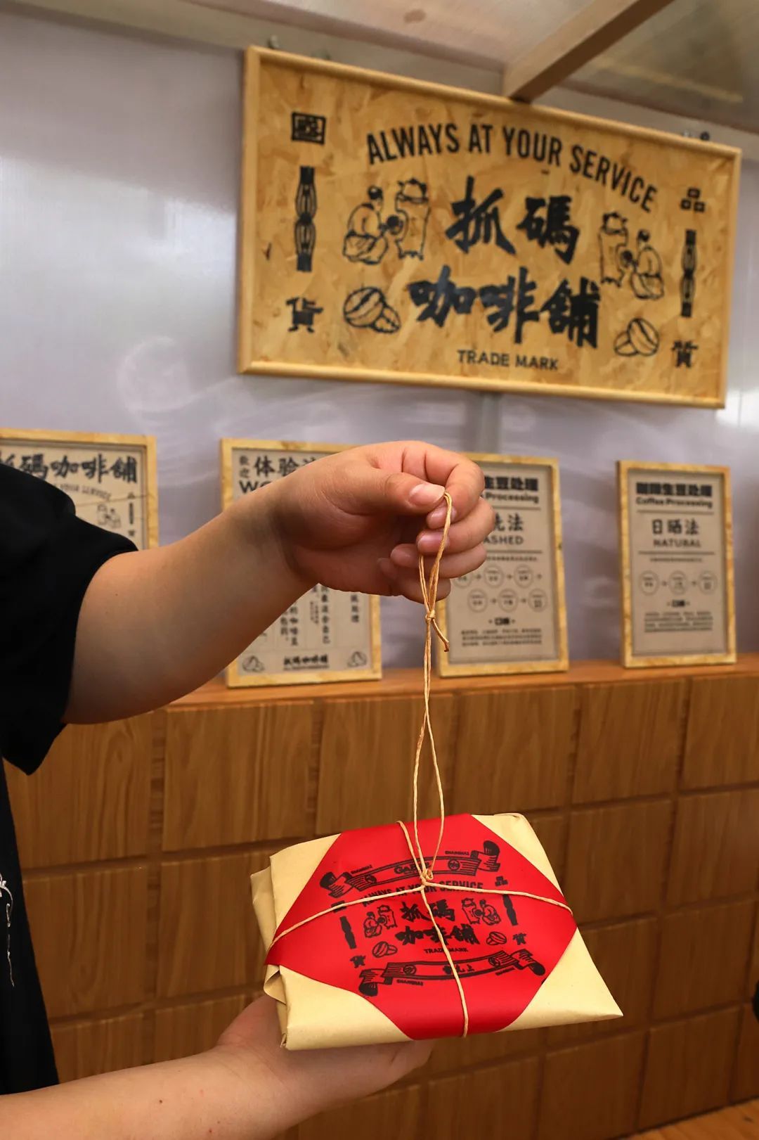身着传统服饰的店员手持戥秤,精准称量咖啡豆,熟练地用古法捆扎牛皮纸方包,红色封贴上还印有复古又不失时尚的“抓码咖啡铺”印章……