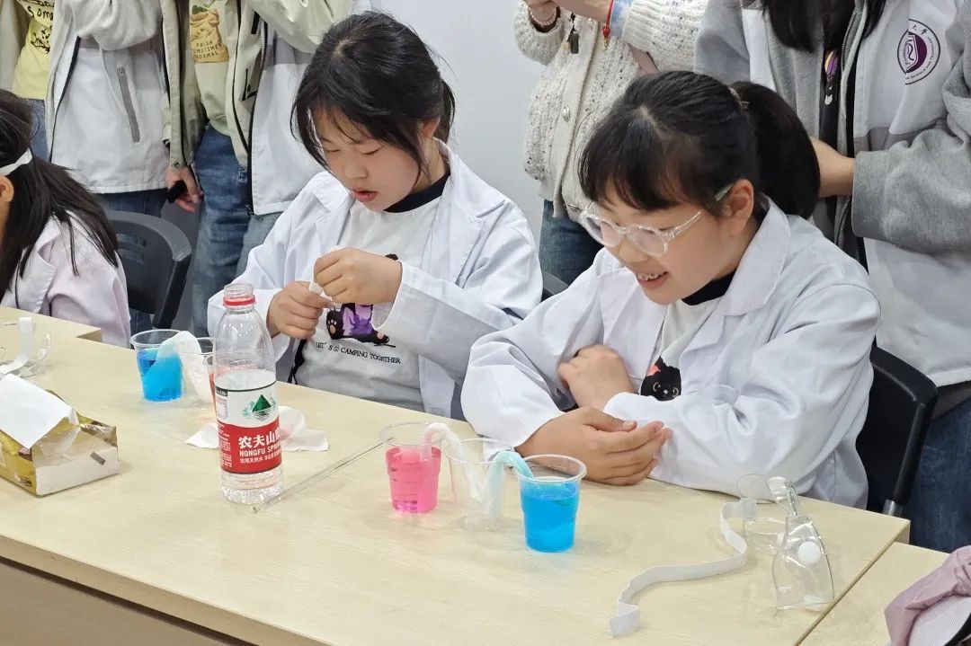 “蓝色湖水”硫酸铜遇上“碱水小魔法师”氢氧化钠,一场颜色“魔术”令孩子惊叹不已。第二个化学实验是颜色变化实验,从清澈到蓝色雪花沉淀,最后又变回透明,孩子们连连惊呼:“像星空!像泡泡!”