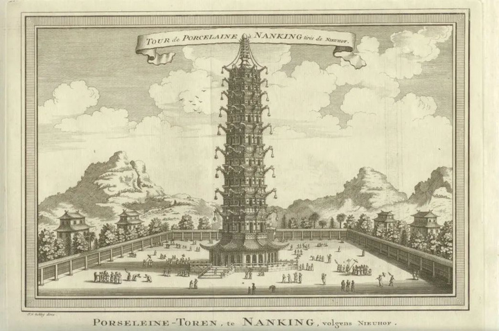 约翰•尼霍夫绘制的大报恩寺琉璃塔 大报恩寺的历史可追溯到三国时期,几经兴废,传承悠久,至明代迎来鼎盛时期。以准宫阙规制建造的大报恩寺琉璃塔被誉为“中国之大古董,永乐之大窑器”,是中国乃至世界建筑史上的奇迹。1655年,荷兰人约翰•尼霍夫随使团访问中国,在《荷使初访中国记》中详尽描绘了南京琉璃塔的壮丽,他的文字和插图让琉璃塔声名远扬,成为“欧洲最为知名的中国建筑”,可媲美罗马斗兽场、比萨斜塔、中国万里长城等中世纪世界七大奇迹建筑。从路易十四凡尔赛宫内的“特里亚农瓷宫”到英国皇家园林里的“邱园宝塔”,以大报恩寺琉璃塔为原型的宝塔模型、建筑仿制品及艺术衍生品在欧洲广受追捧,掀起了一股“中国风”热潮。