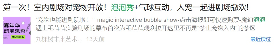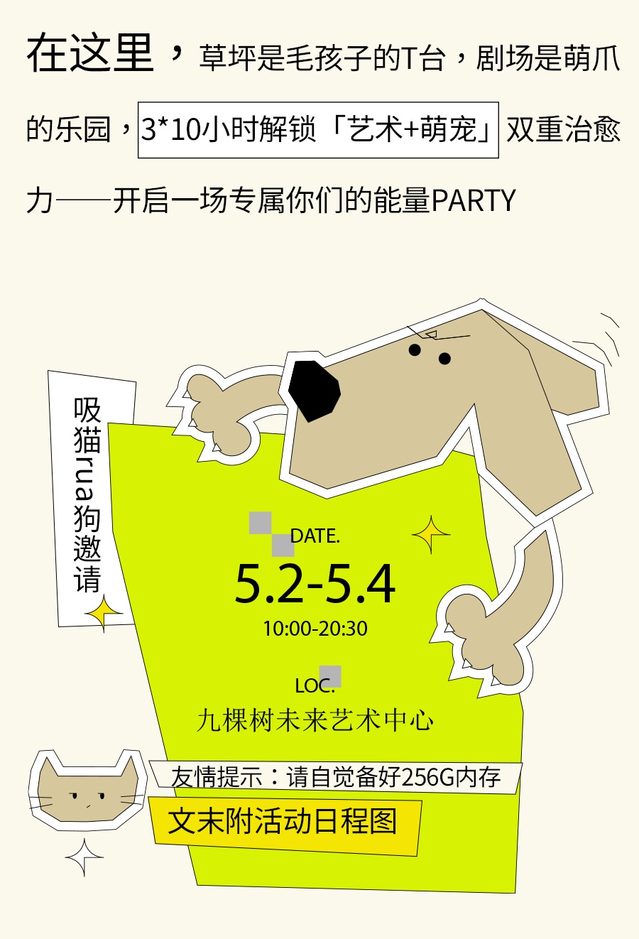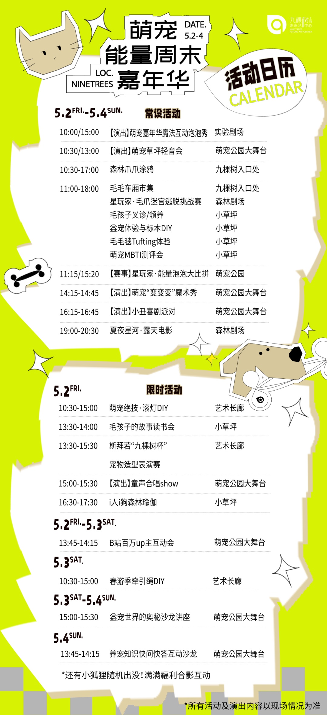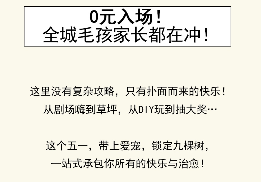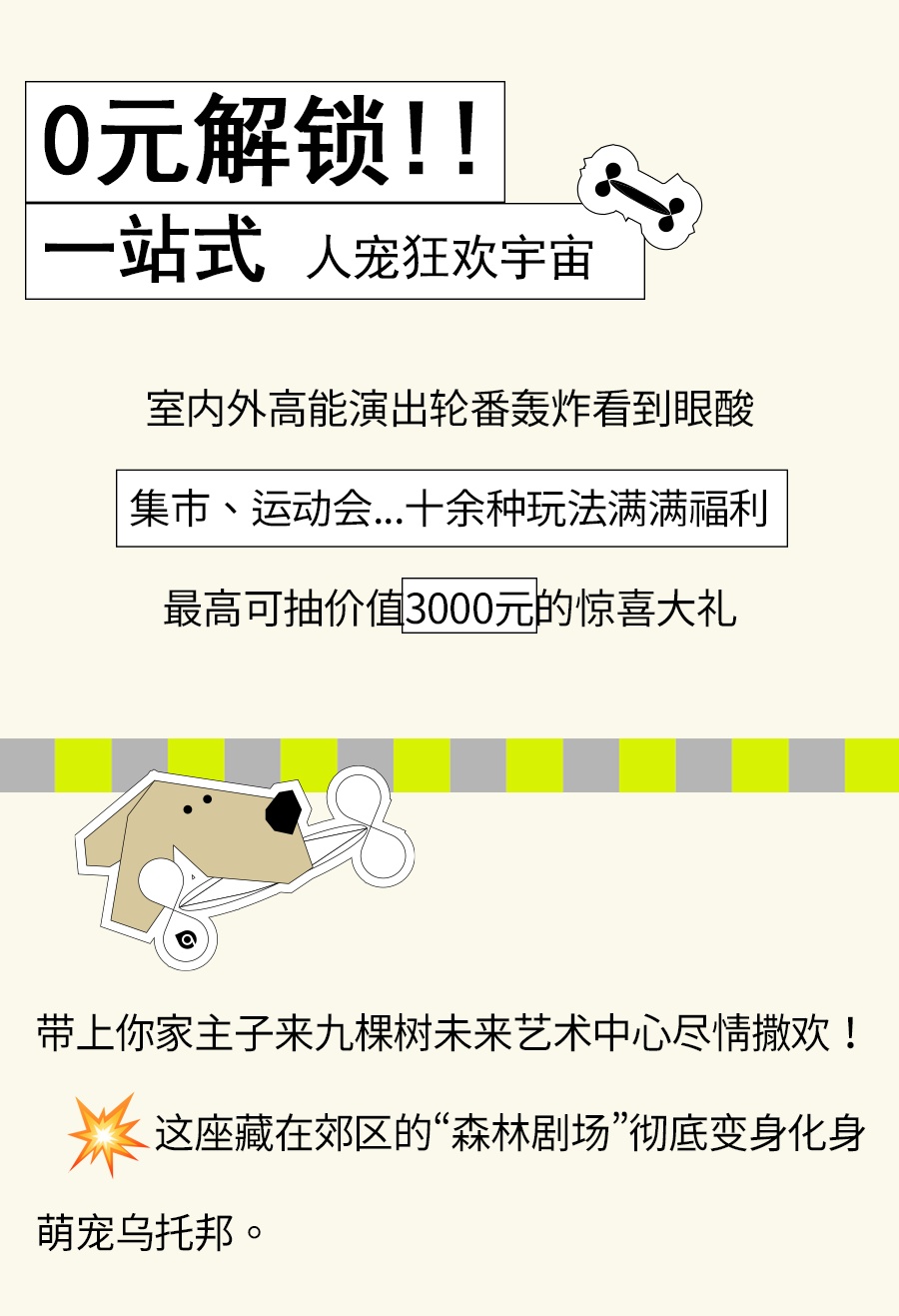 从魔术到杂技,从剧场嗨到草坪,九棵树彻底变身人宠狂欢演出乐园,近60场重磅演出及活动轮番上演,令人目不暇接,室内外双倍快乐任你选! 你有没有将毛孩子带进过室内剧场?九棵树特别打造的《萌宠嘉年华魔法互动泡泡秀》首次将室内剧场对宠物开放,这里不再是"禁止宠物入内"的禁区,而将成为奉贤首个宠物友好式魔幻剧场! ↑戳戳图标即可快速购票↑ 颠覆传统剧场规则,没有拘束的舞台设计,零距离互动环节,巨型泡泡环绕、彩虹气球飞舞,公益票价,让毛孩子们也能拥有自己的剧场VIP座,感受集气球、泡泡于一体的视听盛宴,期待值和性价比直接拉满! 看完了泡泡秀也别着急,户外还有杂技、魔术表演秀、萌宠轻音会等N多演出节目,包你看不停的。 不仅可以看到杂技高手与“修勾”同台battle,还可以找找音乐会中藏着的“狗狗”专属BGM 看够了演出还不满足?别着急,我们还有——测TA是E狗还是i猫?围观剪毛“修”狗现场?看“修勾”赛跑逆袭短腿柯基?还有B站up主现场分享训宠经验…… 萌宠版MBTI 是社交悍匪修勾?还是i型高冷艺术家猫嘘——你家主子的小心思藏不住了!北美创意团队带着「宠物版MBTI黑科技」空降九棵树,专治“不懂毛孩”的世纪难题!科学诊断毛孩隐藏属性! 原来狗子不是拆家,是ESTP探险家の日常;猫猫不是甩脸,是INFJ大师の深度思考……精准拿捏TA的灵魂标签,从此告别“我家逆子到底在想啥”的哲学难题~ 速带主子对号入座,解锁科学养宠の终极奥义! 宠物造型表演赛 趣味十足的宠物剪毛表演赛也会在这里拉开帷幕,看托尼老师们的八仙过海,各显身手,是翻车泥石流,还是宠物版巴黎时装周?瓜子板凳已备好,速速前来围观! 迷宫逃脱&泡泡比拼 当然啦!活动期间还将不间断举办各项宠物挑战赛,快来带上你的小伙伴过关斩将,拿下胜利,赢取奖品吧~ B站百万up主互动会 九棵树也特别邀请了B站百万UP主携明星宠物来到现场和大家面对面分享养宠的小妙招。此外还有宠物义诊、领养、互动体验等超多丰富有趣的治愈系活动。 滚灯、tufting、牵引绳…… 艺术长廊变身“小狗路”&“小猫路”,多巴胺色调×萌宠好物,不仅有集市shopping不停,现场还可以体验超多互动手作DIY,比如说绘制滚灯,也可以给狗子做一条专属你们的牵引绳! 你能想到、能看到的宠物活动,在这里应有尽有,来九棵树和你的毛孩子一起拥抱春日浪漫。 就连小草坪也舒适感拉满! 森林瑜伽、毛孩子读书会等连番上演……体验科学证明:当《猫の呼噜ASMR》响起时,人类焦虑值下降73%~ 当然,瘫在草坪读《猫的哲学》也不失为一种好选择,听行为学家揭秘“狗子拆家不是叛逆,是ENFP探险家的神圣使命!” 还有首个开进剧院的宠物鲜食餐车!可爱涂装+专属餐点,携手@耐威克 1919公益活动,关心自家毛孩子的饮食,也关心流浪小动物的饱餐,简直就是最具温度的必打卡点! 夜晚更是可以带上狗猫,坐在超大草坪上,吹着晚风,享受一场露天电影,从早玩到晚,释放疲惫浪漫加码,一站式承包你的嗨玩刚需! 没错,终于到了大家最关心的福利环节啦!别担心,九棵树这次为大家准备了各种惊喜礼物 首先就是“上海奉贤”特别福利!!价值80元的《萌宠嘉年华魔法互动泡泡秀》演出门票!!截至4月21日上午10点,我们将抽取留言区top6,每人赠送演出门票2张,还是那个实验剧场,但这一次,携宠进剧院! ↑点击查看剧目介绍↑ 0元即可参与集章活动,百元礼包正在向你招手,已经帮大家偷偷看过,洗护用品、宠物罐头、玩具等应有尽有,斯拜若、耐威克、皇家等宠物品牌重磅入驻,更多惊喜现场领取,包你满意的~ 此外,这次的抽奖活动更是超级豪华!九棵树将送出价值3150元的终极大奖—— 前昇希尔顿 Pets Villa宠物别墅套房*1晚 走入狗生巅峰的机会就在眼前 你负责羡慕,TA负责炫富,拼手气的时候就在这一刻。 另外还有豪华宠物烘干机,顶级狗窝...…超多创意周边等你带走 这里有最前沿的遛宠方式,最有趣的rua宠搭子,最艺术的互动体验,五一假期,锁定九棵树,带你一站式感受魔都遛宠的天花板! *星玩家·毛爪迷宫挑战赛、森林瑜伽等活动将第一时间于该群聊中开启报名,欢迎加入宠群,与更多家长共享狂欢!