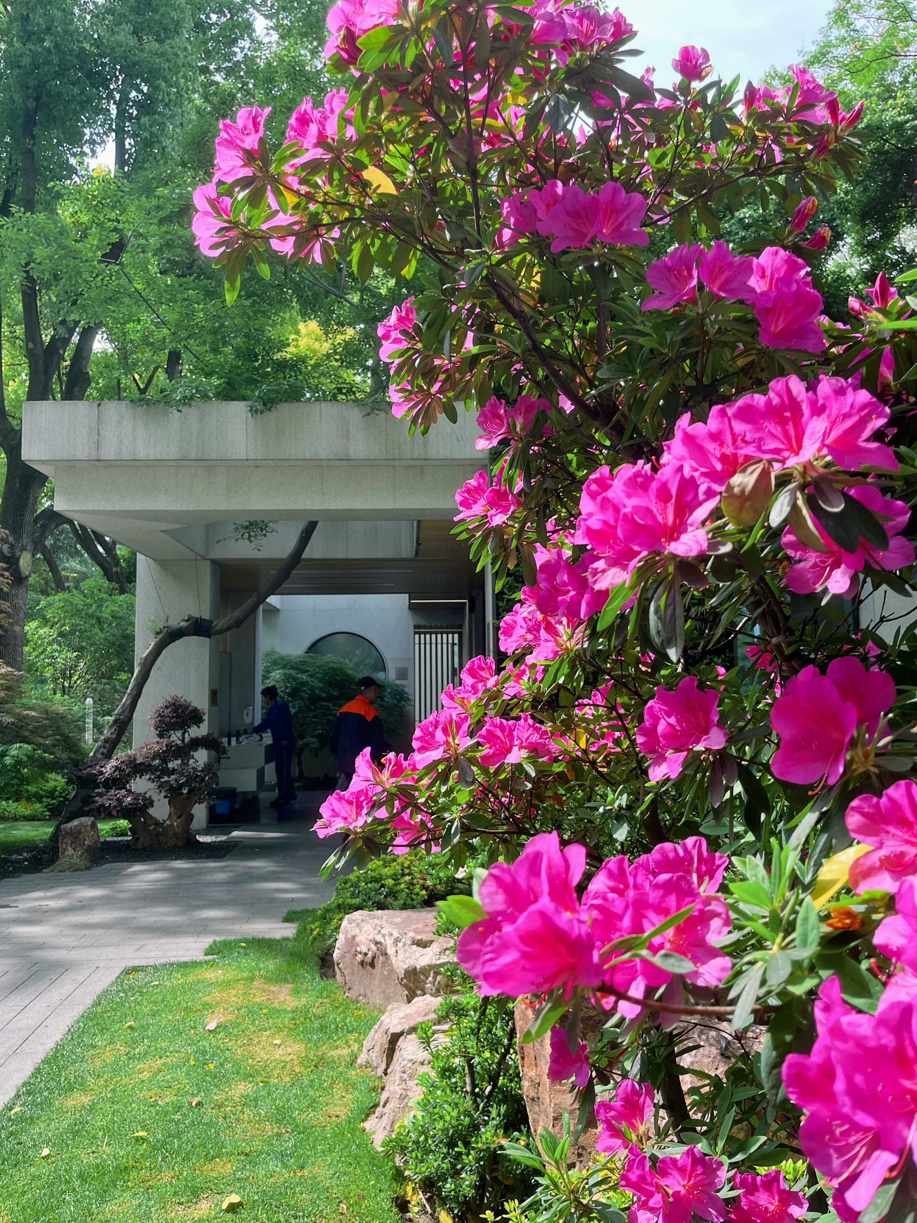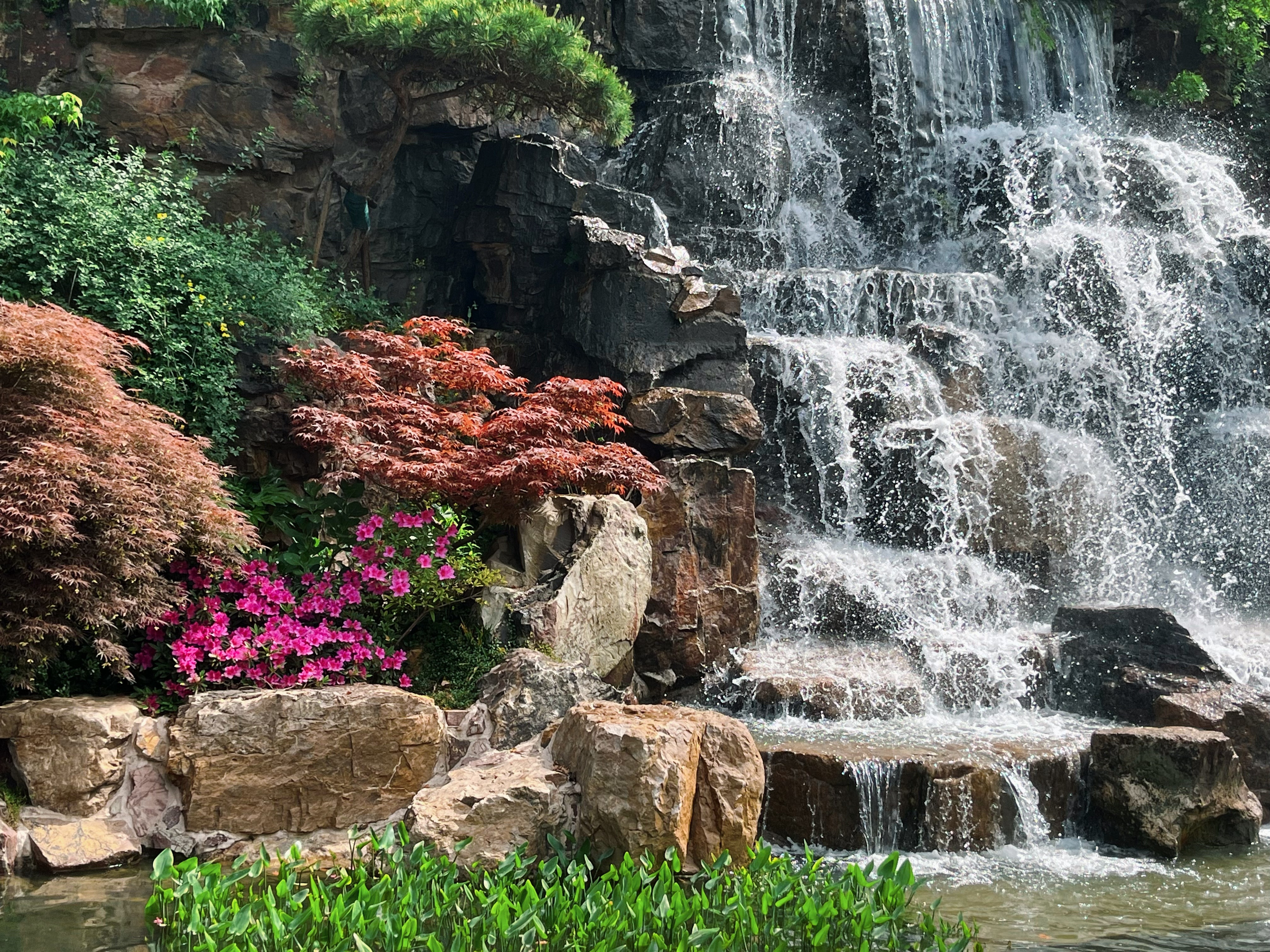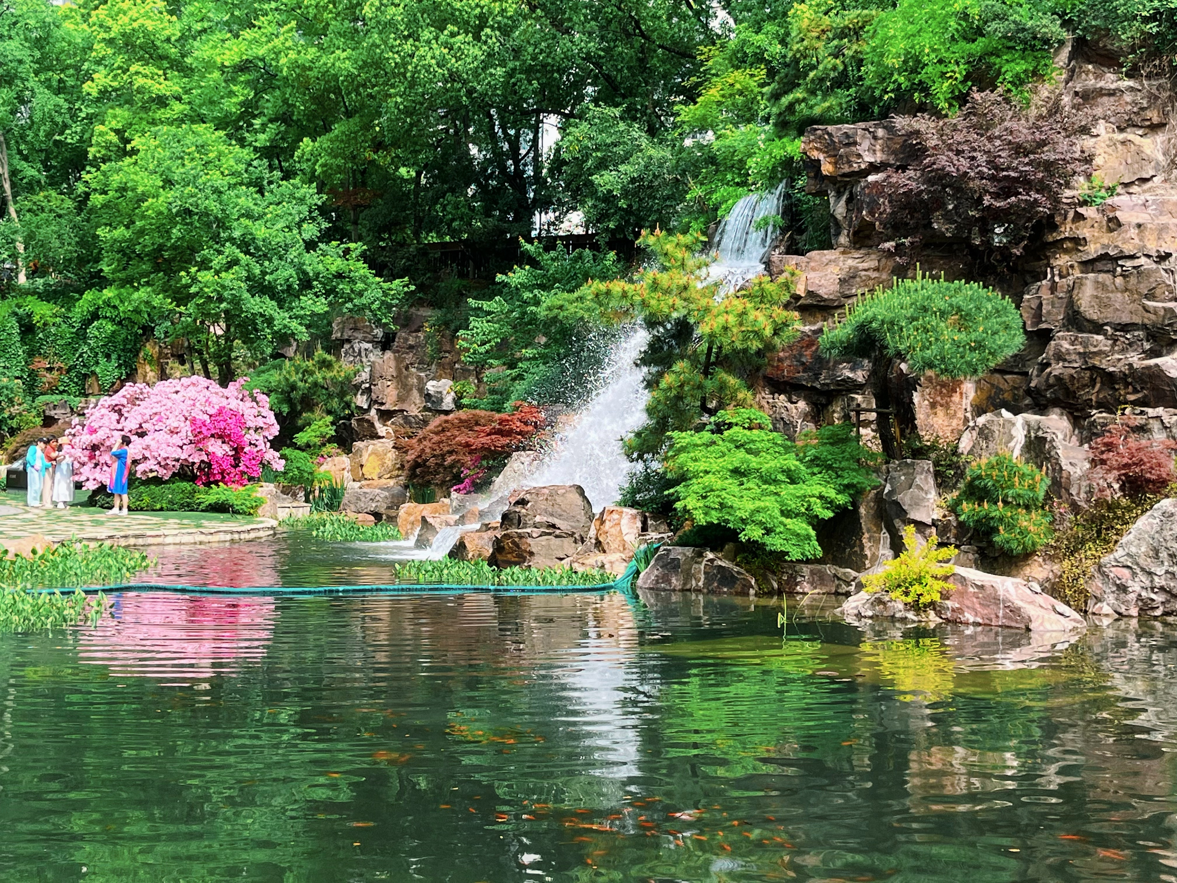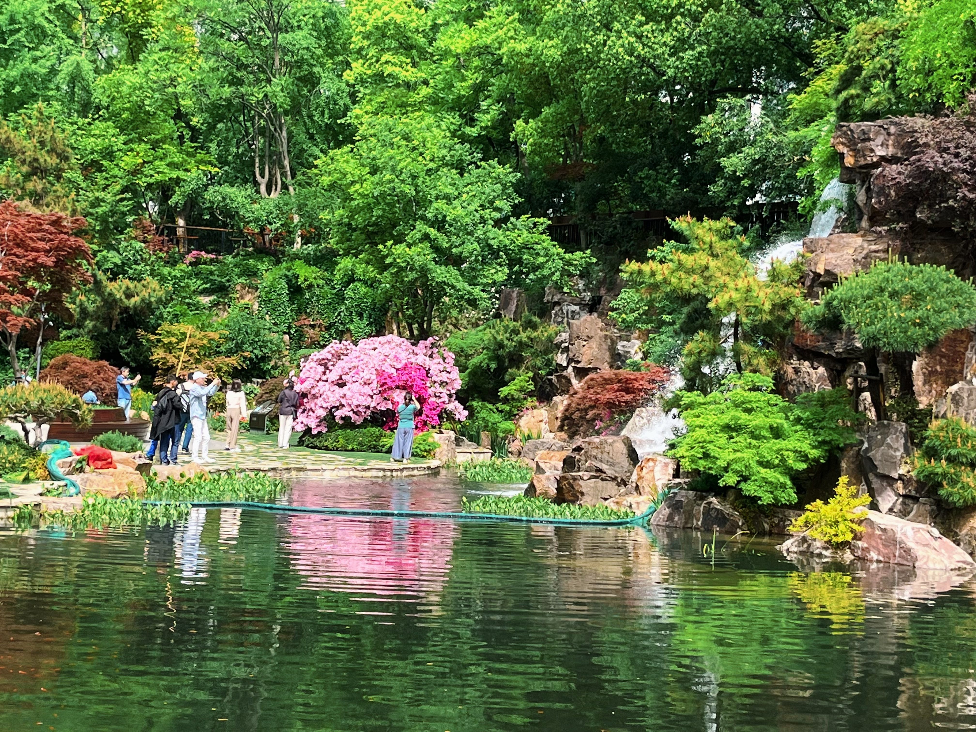 水池畔一株最大的杜鹃已到盛花期,双色花朵密密匝匝,只见花不见叶,与人工瀑布的银练交织成一场视觉奇观。湖畔水雾氤氲间,花瓣沾着细密水珠,折射出琉璃般的光泽,令人流连忘返。