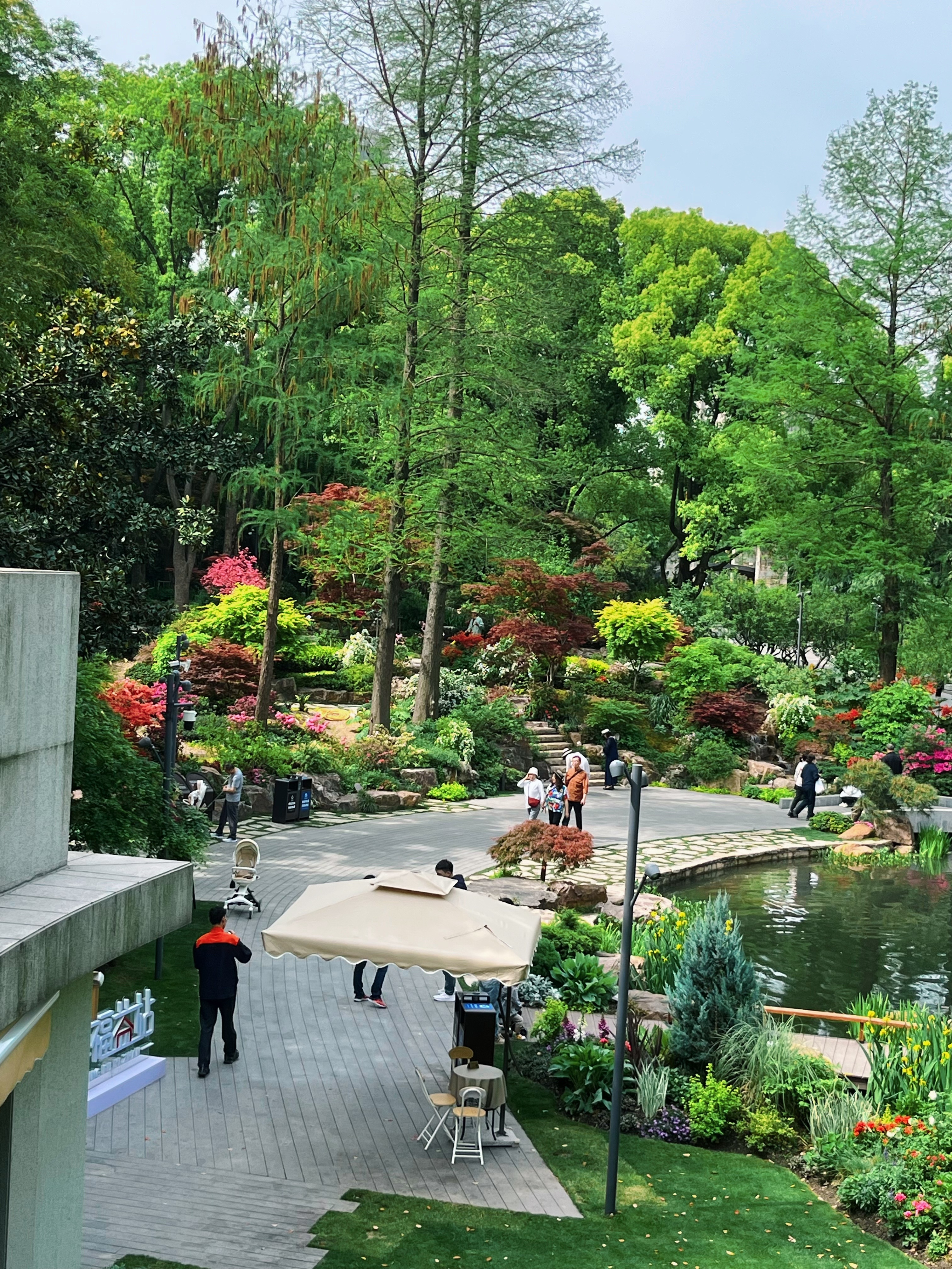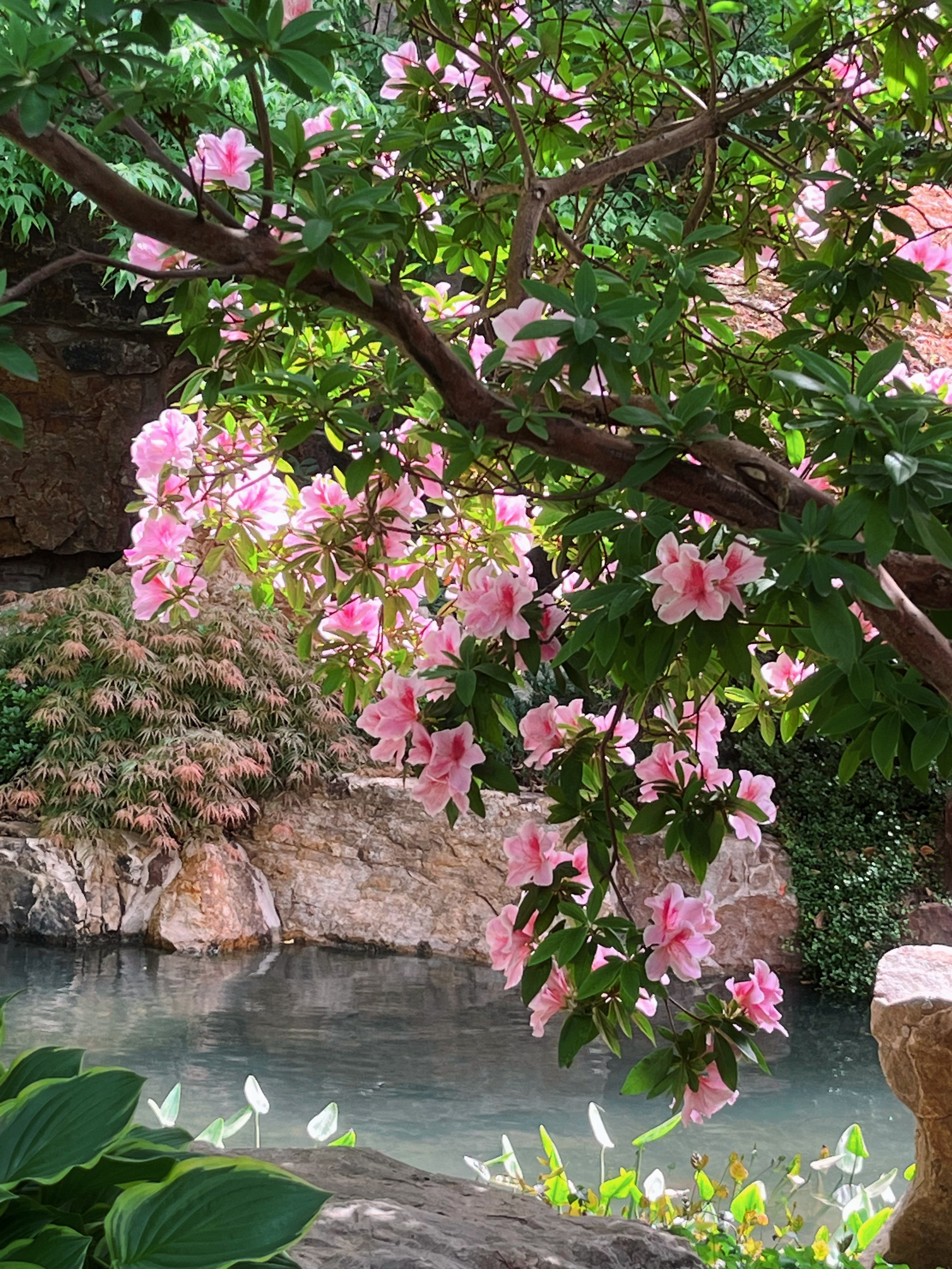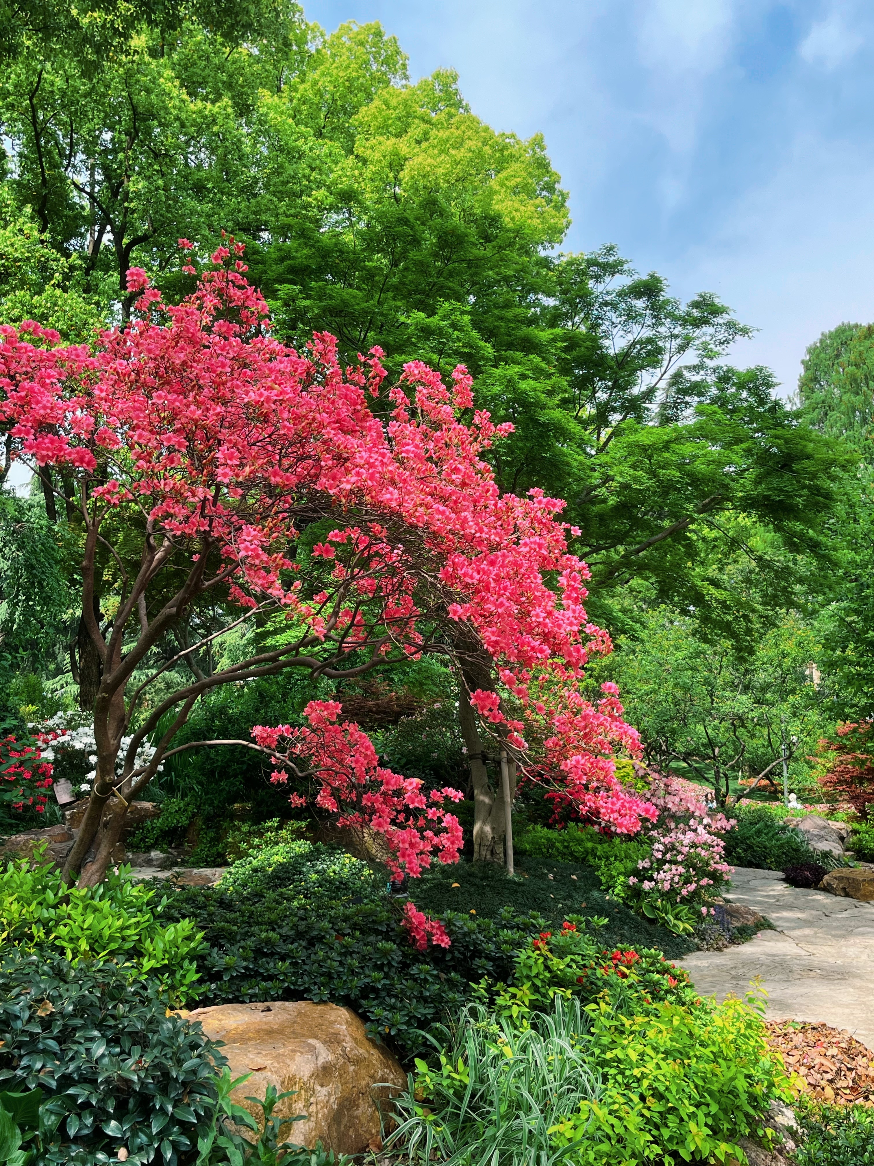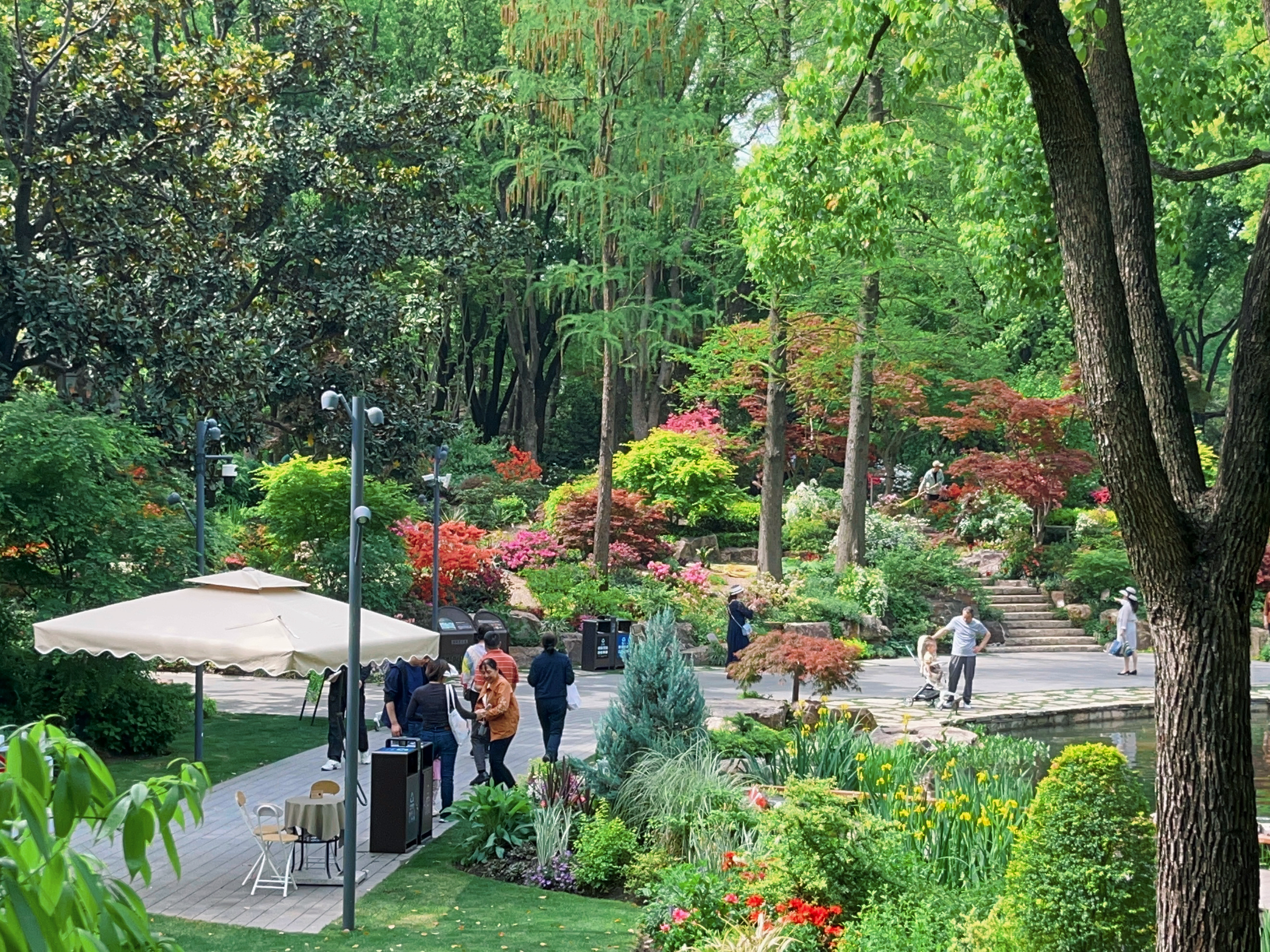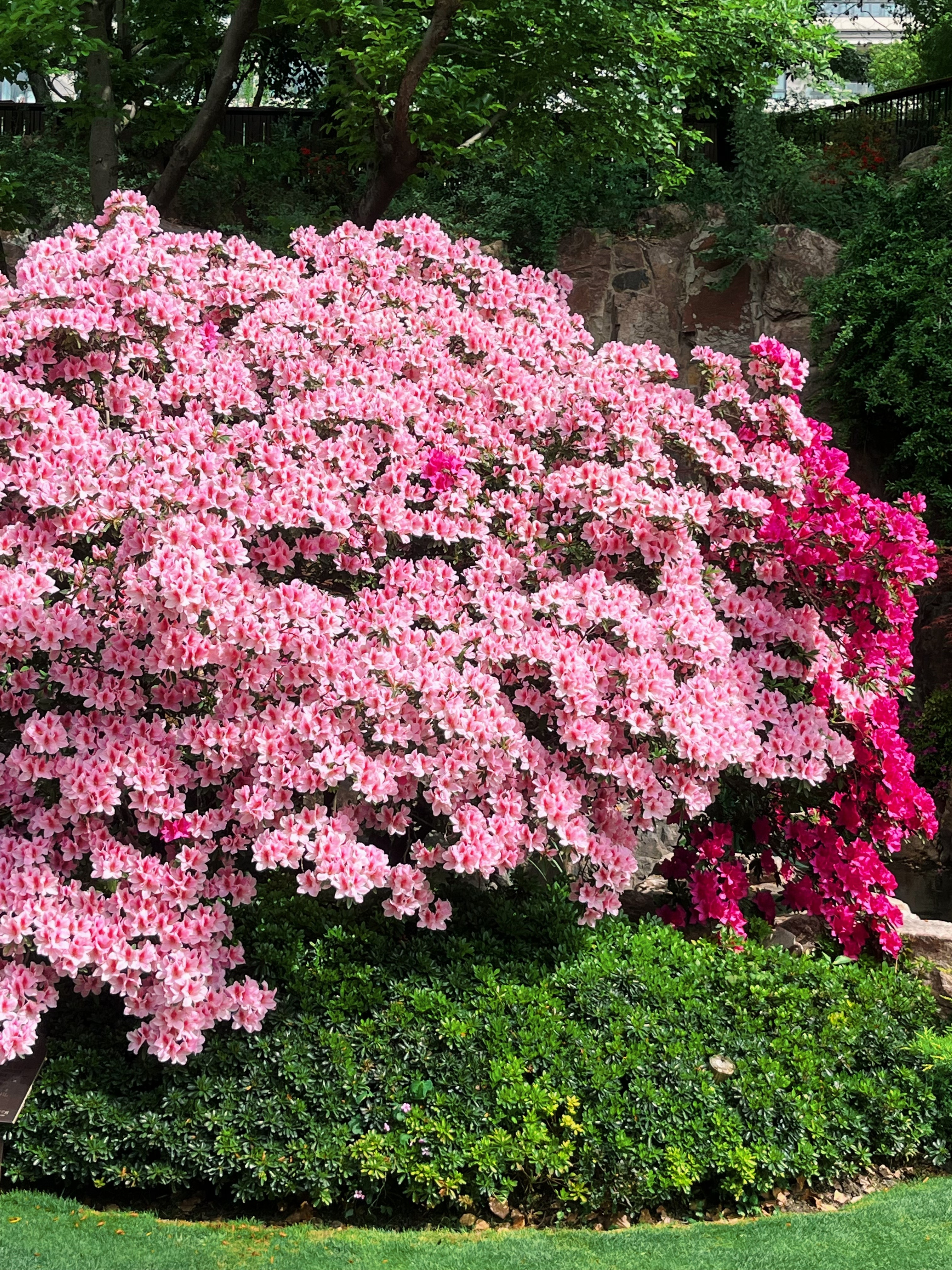 水池畔一株最大的杜鹃已到盛花期,双色花朵密密匝匝,只见花不见叶,与人工瀑布的银练交织成一场视觉奇观。湖畔水雾氤氲间,花瓣沾着细密水珠,折射出琉璃般的光泽,令人流连忘返。