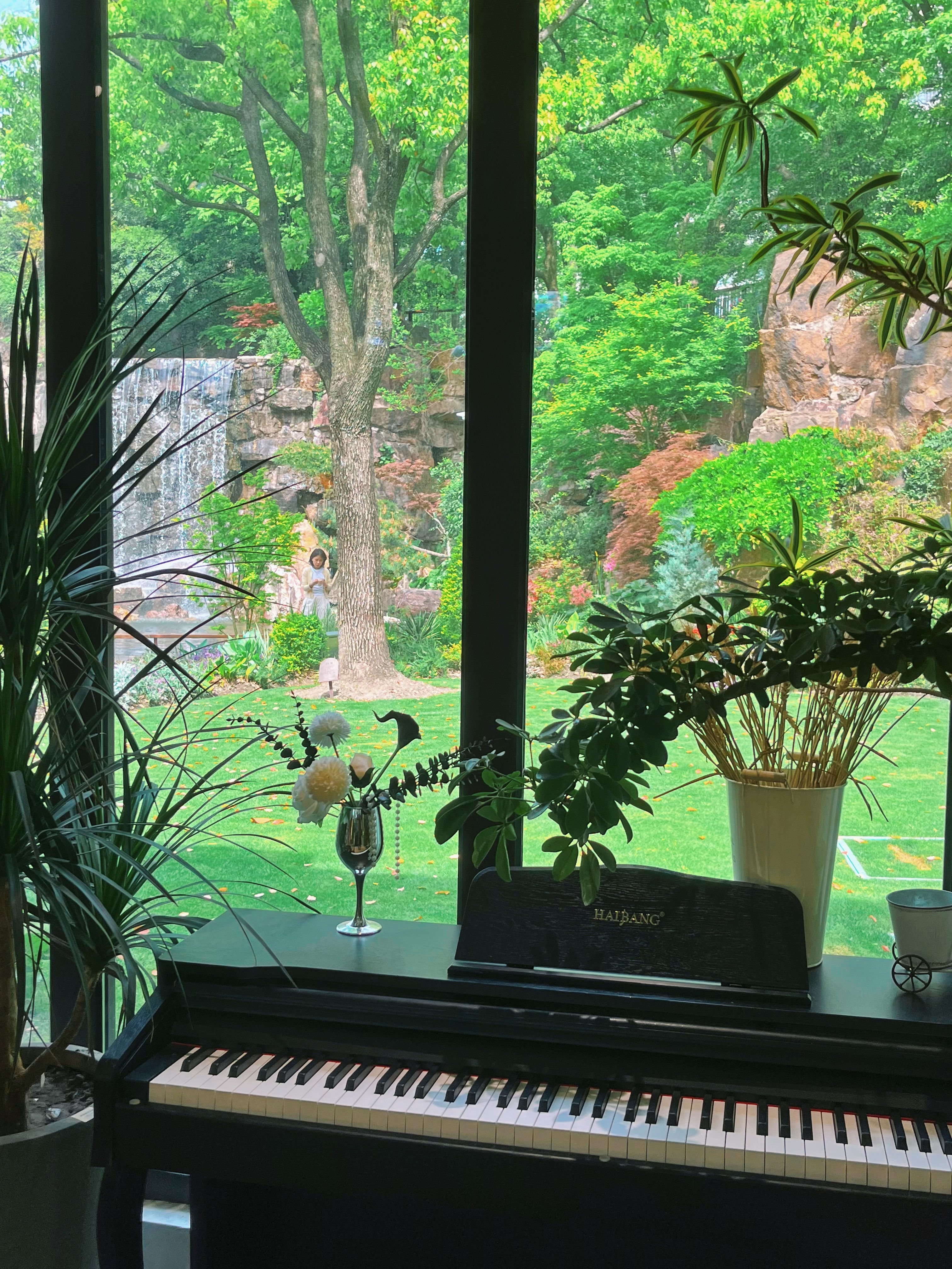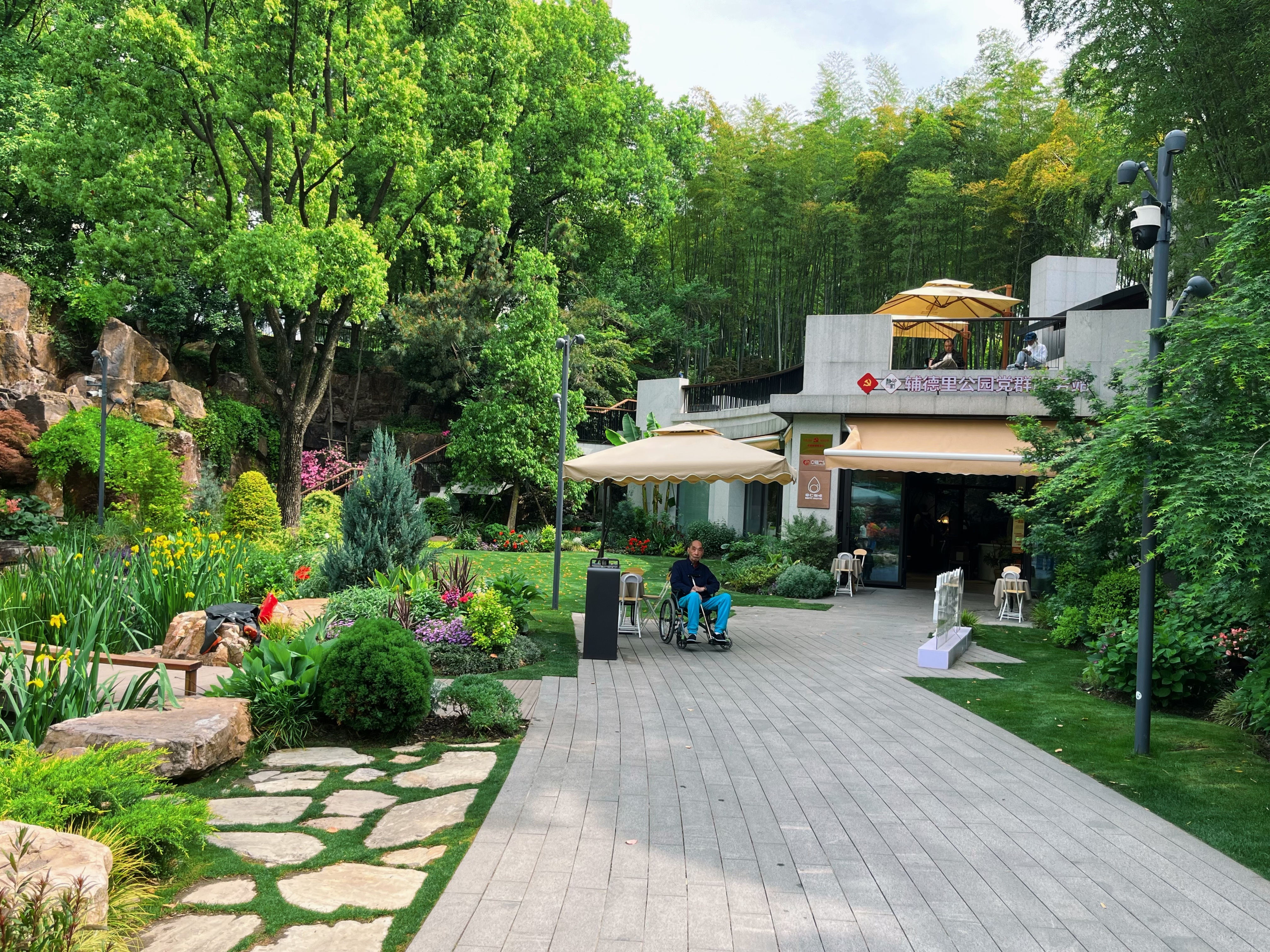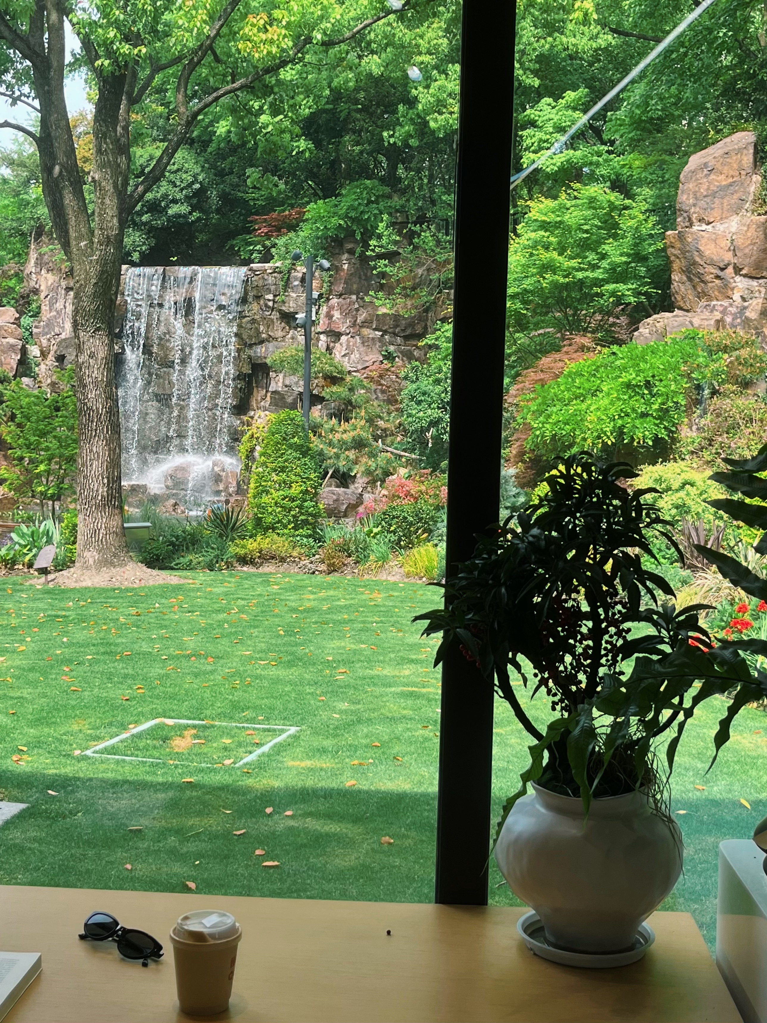 叠石瀑布附近的公园党群服务站(同时也是公园游客中心、市民园艺中心)内,还有一家森系咖啡店,价格平价但风景绝佳。
