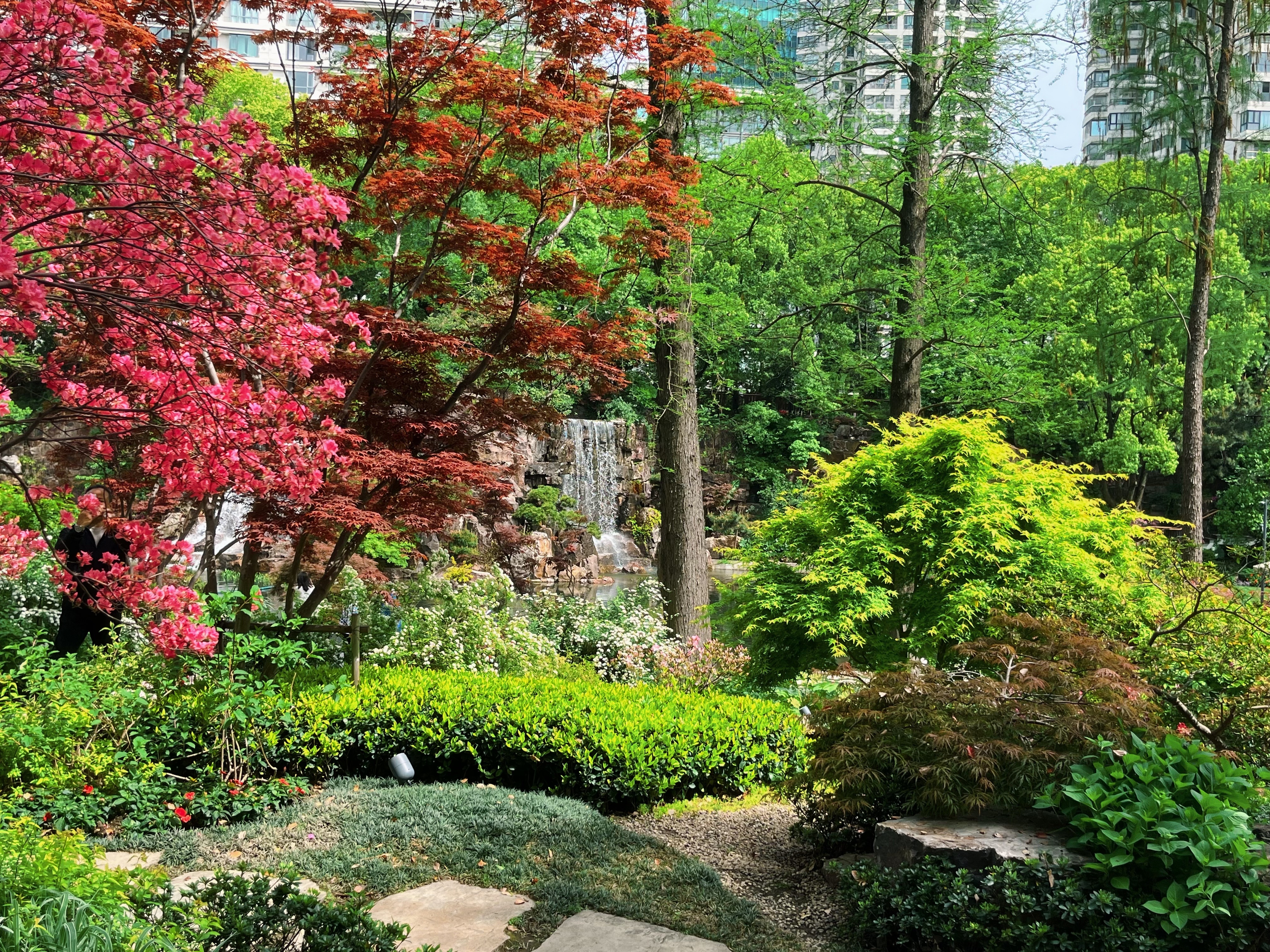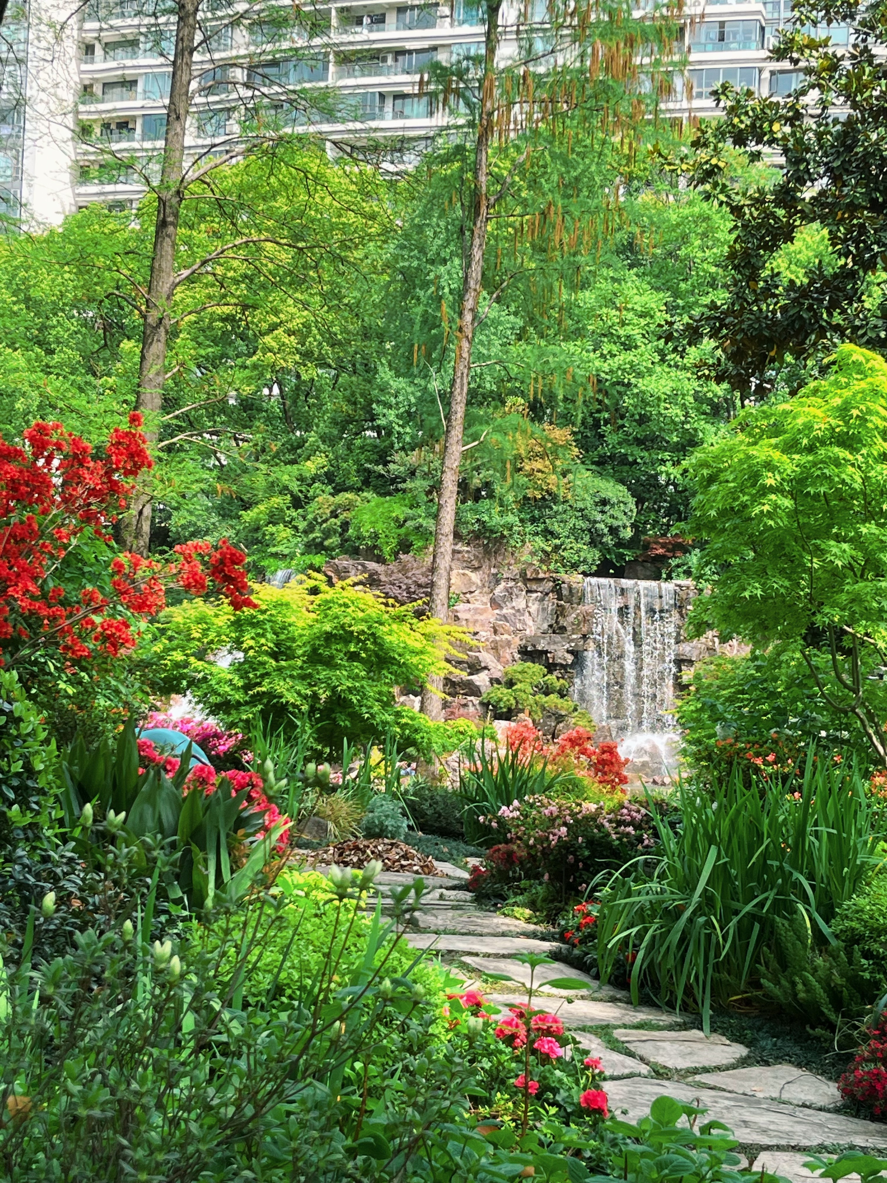 开满杜鹃花的瀑布山谷,出现在上海市中心——听起来有些不可思议,但这并非童话中的幻境,而是四月静安辅德里公园正在上演的真实图景。这座隐匿于闹市的“秘境山谷”正以漫山杜鹃的盛开,泼洒出一幅流动的锦绣长卷。