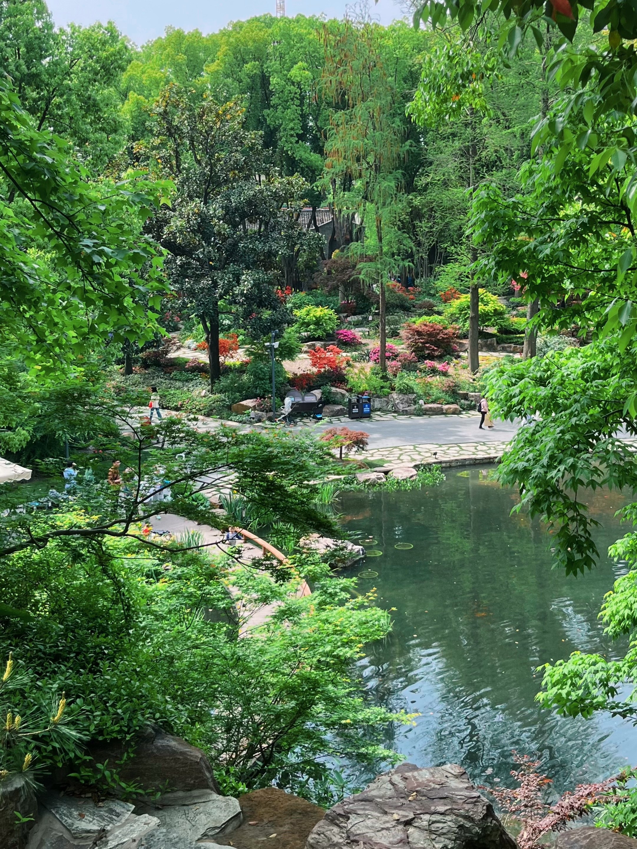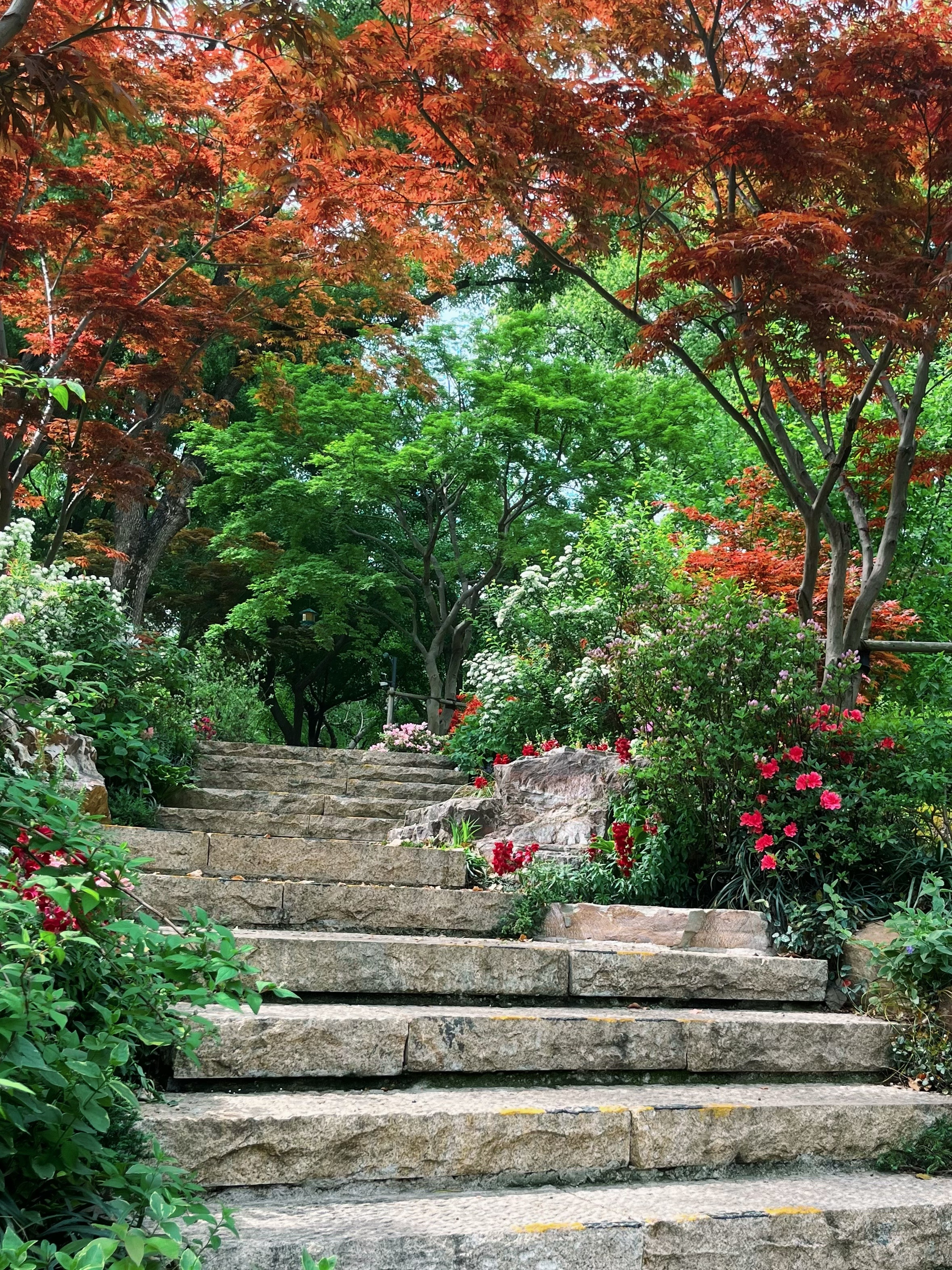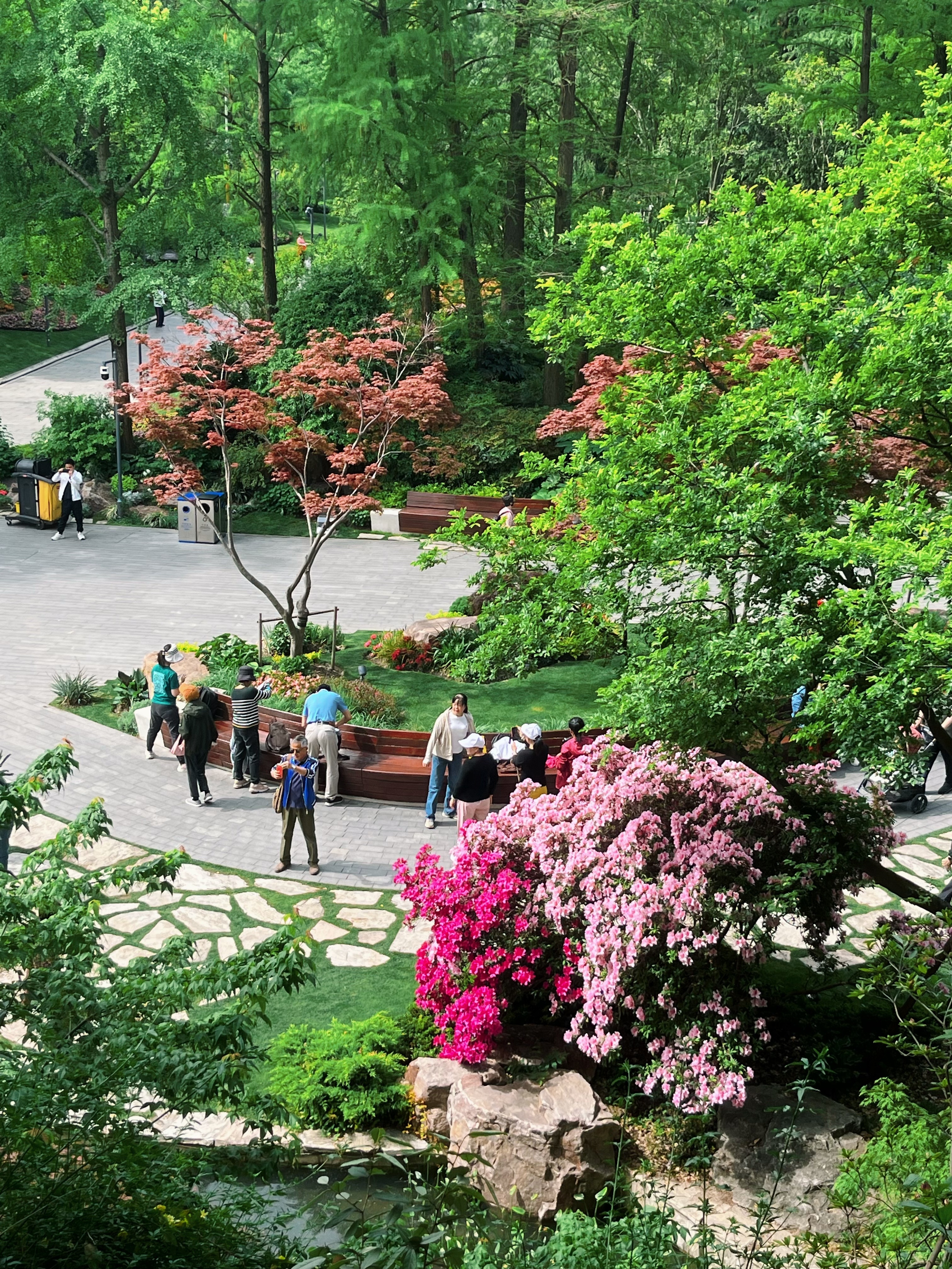 登到高处向下俯瞰,坡地、林间、崖壁、岩石、湖泊、溪流、杜鹃尽收眼底,花开绚丽、叶色锦绣将辅德里公园的精巧展现得淋漓尽致。