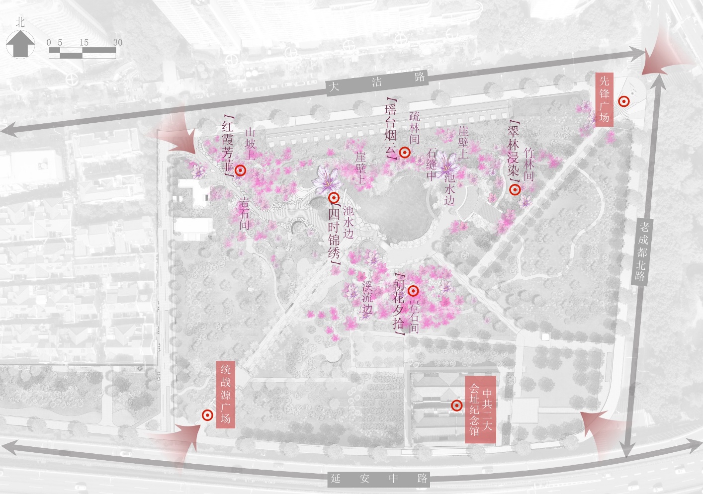 据公园景观设计方北斗星景观介绍,不仅因为杜鹃花在中国历史悠久、品种丰富,为文人墨客所欣赏,也不仅仅因为杜鹃花又名“映山红”暗合隐喻红色漫步的寓意(中共二大会址纪念馆坐落在公园东南角),更重要的是,杜鹃花是最适合营造山花烂漫、花团锦簇的品种之一,而辅德里公园的原有地形和茂密的植被完美匹配杜鹃生长所需要的小气候环境。