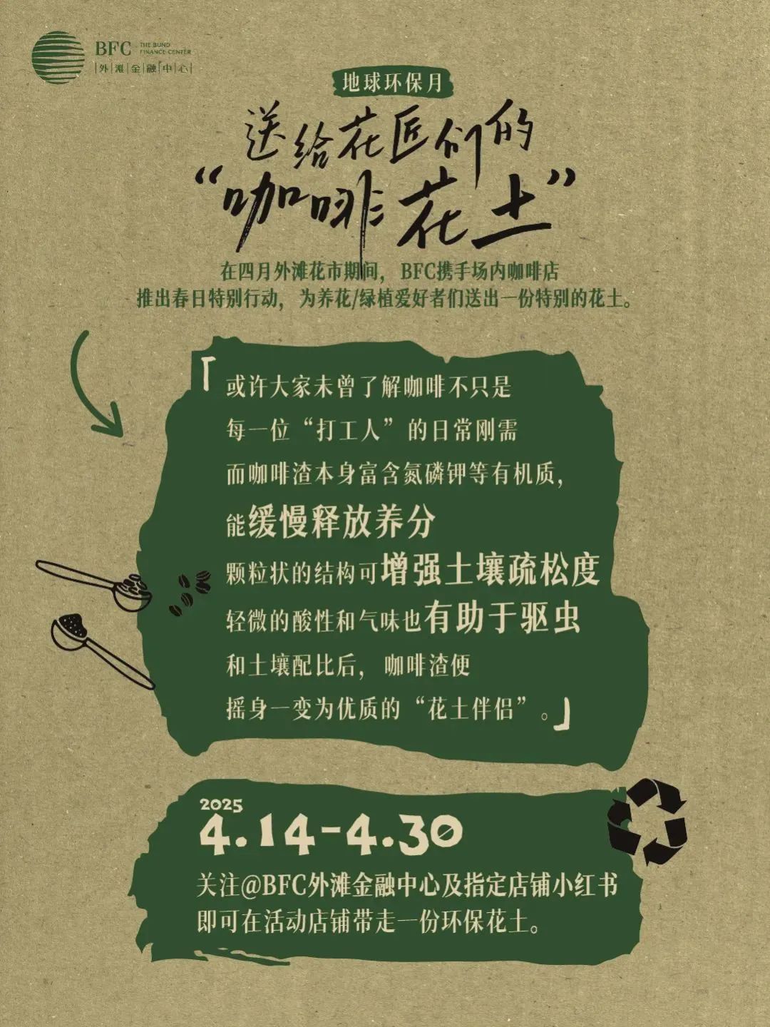 四月外滩花市期间,BFC携手场内咖啡店,推出春日特别行动,为养花/绿植爱好者们,送出一份特别的花土。