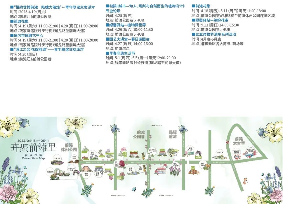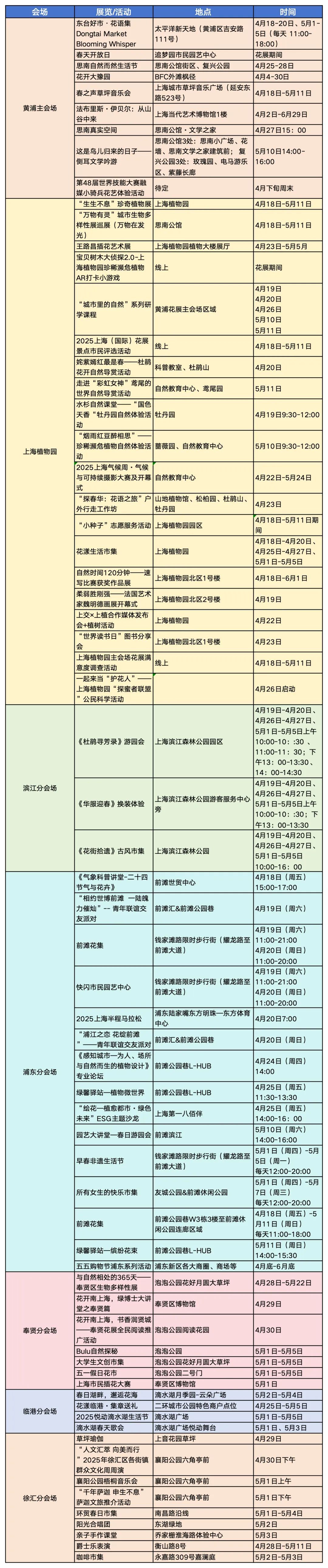 太平桥绿地、复兴公园、思南公馆、南京路步行街(4月18日-5月11日)。