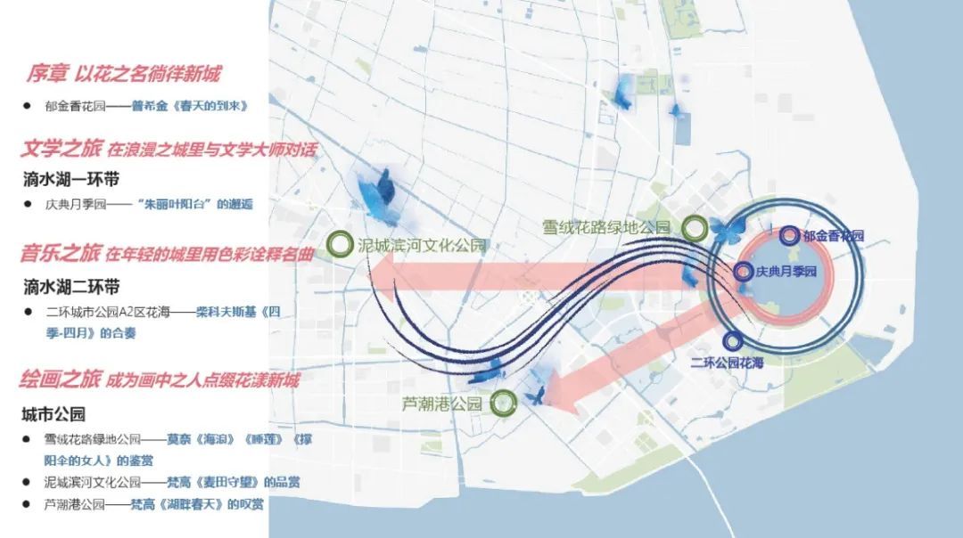 南汇新城镇区域点位可乘坐16号线地铁到达滴水湖站,骑行前往月季园、雪绒花路绿地、春花秋色花海区域;泥城滨河文化公园及芦潮港公园可通过乘坐中运量T1线前往。