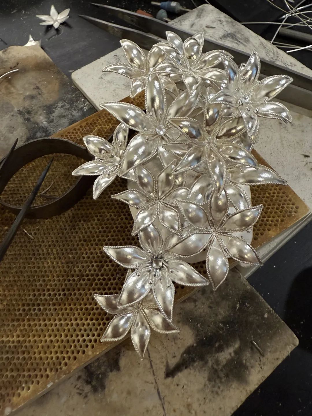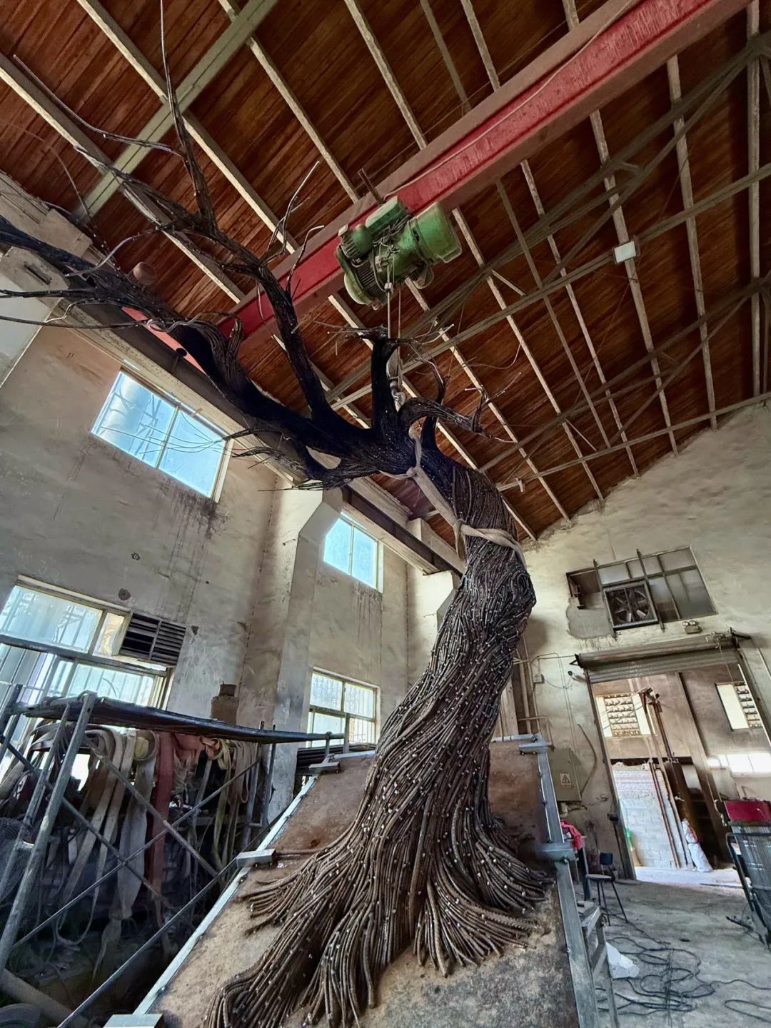 他还回收了600多公斤的废弃钢筋作为树干。钢筋看上去有些呆板,需要做S型柔化处理。他采用了非遗掐丝技艺,通过排线的方式,形成空间构造。每根钢筋需要纯手工制作,工作量有些大,前后花费了三个多月的时间。