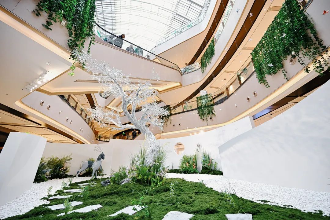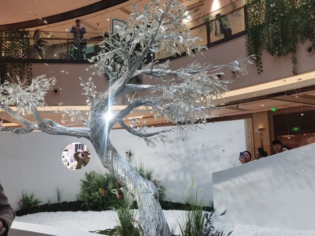 走进兴业太古汇LG1北厅,这里出现了一片春意盎然的“魔法森林”,这是顾天予融合非遗花丝盘丝的工艺思维创作的大型公共艺术项目《焕然 Reborn》。